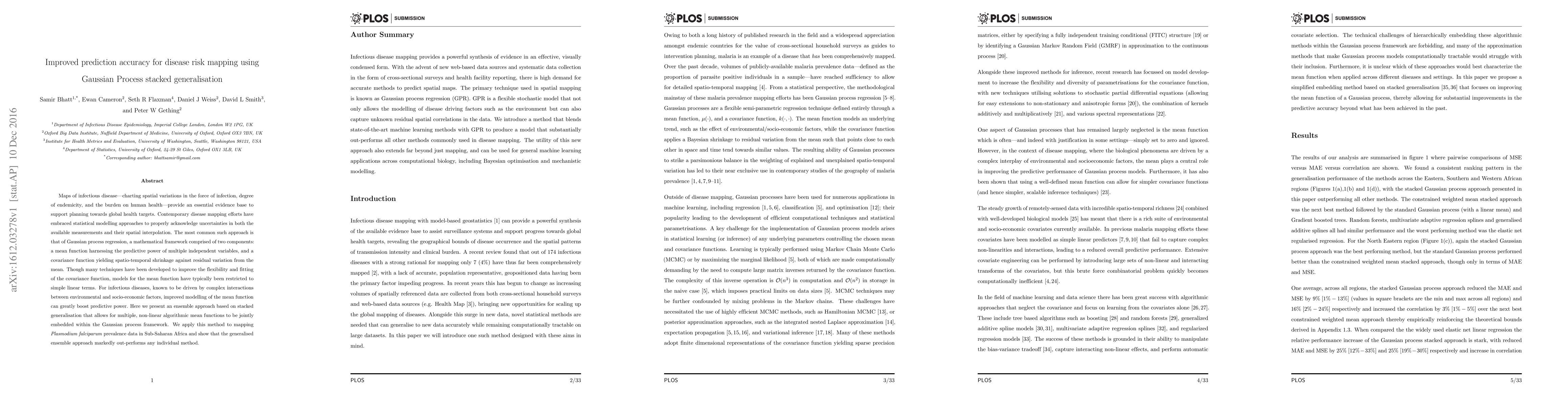 This paper proposes an ensemble method using stacked generalisation within Gaussian process regression to enhance disease risk mapping accuracy. The approach integrates multiple non-linear mean functions, significantly improving predictions for Plasmodium falciparum prevalence in Sub-Saharan Africa compared to traditional methods.