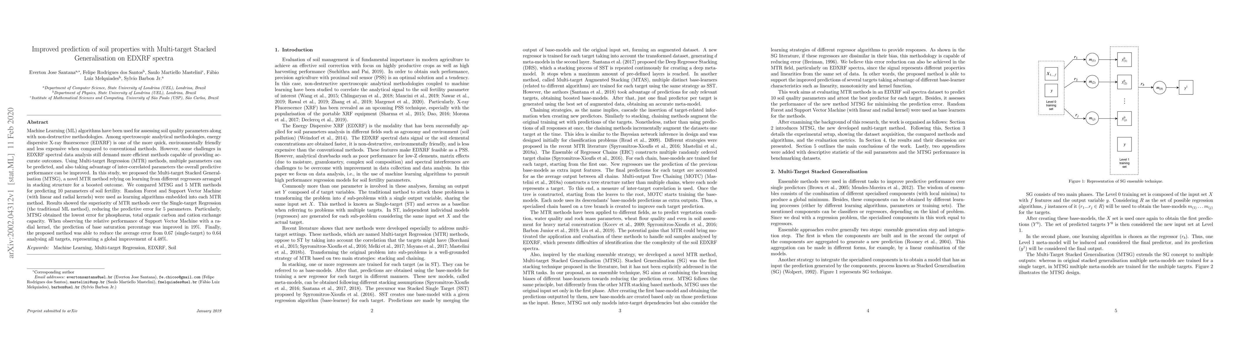 This paper proposes Multi-target Stacked Generalisation (MTSG) for predicting soil fertility parameters using EDXRF spectra. Compared to single-target regression, MTSG and other multi-target methods significantly reduced prediction errors, especially for phosphorus, total organic carbon, and cation exchange capacity, achieving a 4.48% global error reduction.
