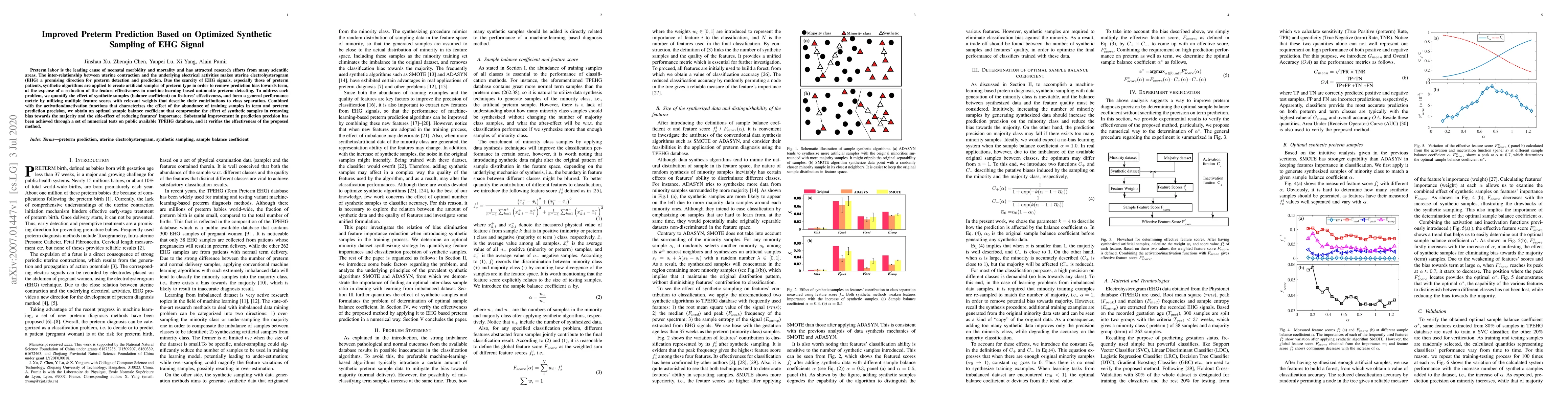 Preterm labor is the leading cause of neonatal morbidity and mortality and has attracted research efforts from many scientific areas. The inter-relationship between uterine contraction and the underlying electrical activities makes uterine electrohysterogram (EHG) a promising direction for preterm detection and prediction. Due the scarcity of EHG signals, especially those of preterm patients, synthetic algorithms are applied to create artificial samples of preterm type in order to remove prediction bias towards term, at the expense of a reduction of the feature effectiveness in machine-learning based automatic preterm detecting. To address such problem, we quantify the effect of synthetic samples (balance coefficient) on features' effectiveness, and form a general performance metric by utilizing multiple feature scores with relevant weights that describe their contributions to class separation. Combined with the activation/inactivation functions that characterizes the effect of the abundance of training samples in term and preterm prediction precision, we obtain an optimal sample balance coefficient that compromise the effect of synthetic samples in removing bias towards the majority and the side-effect of reducing features' importance. Substantial improvement in prediction precision has been achieved through a set of numerical tests on public available TPEHG database, and it verifies the effectiveness of the proposed method.