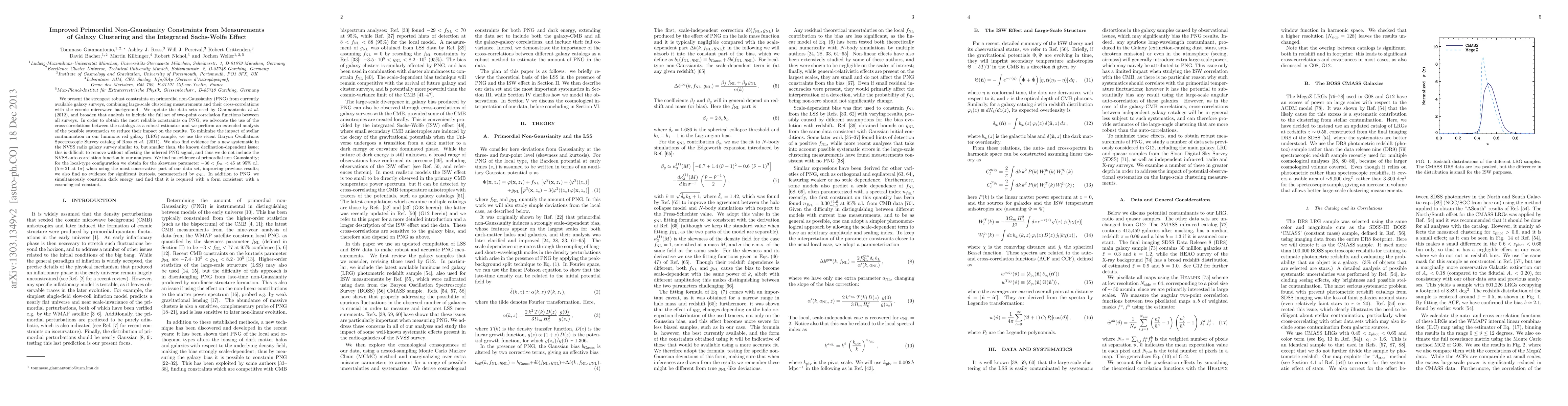 We present the strongest robust constraints on primordial non-Gaussianity (PNG) from currently available galaxy surveys, combining large-scale clustering measurements and their cross-correlations with the cosmic microwave background. We update the data sets used by Giannantonio et al. (2012), and broaden that analysis to include the full set of two-point correlation functions between all surveys. In order to obtain the most reliable constraints on PNG, we advocate the use of the cross-correlations between the catalogs as a robust estimator and we perform an extended analysis of the possible systematics to reduce their impact on the results. To minimize the impact of stellar contamination in our luminous red galaxy (LRG) sample, we use the recent Baryon Oscillations Spectroscopic Survey catalog of Ross et al. (2011). We also find evidence for a new systematic in the NVSS radio galaxy survey similar to, but smaller than, the known declination-dependent issue; this is difficult to remove without affecting the inferred PNG signal, and thus we do not include the NVSS auto-correlation function in our analyses. We find no evidence of primordial non-Gaussianity; for the local-type configuration we obtain for the skewness parameter $ -36 < f_{\mathrm{NL}} < 45 $ at 95 % c.l. ($5 \pm 21$ at $1\sigma$) when using the most conservative part of our data set, improving previous results; we also find no evidence for significant kurtosis, parameterized by $g_{\mathrm{NL}}$. In addition to PNG, we simultaneously constrain dark energy and find that it is required with a form consistent with a cosmological constant.