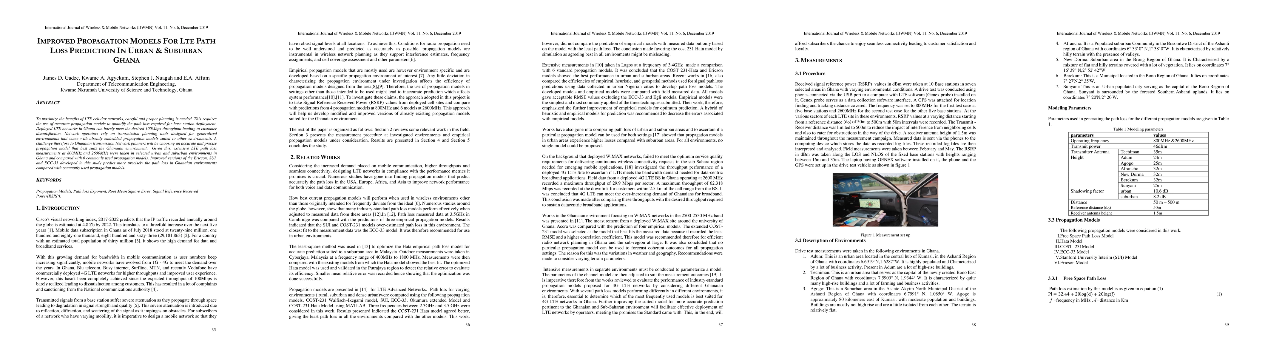 This study develops improved propagation models for LTE path loss prediction in urban and suburban Ghana, comparing extensive measurements at 800MHz and 2600MHz with 6 common models. The new Ericson, SUI, and ECC-33 models provide more accurate path loss predictions than existing models for Ghanaian environments.