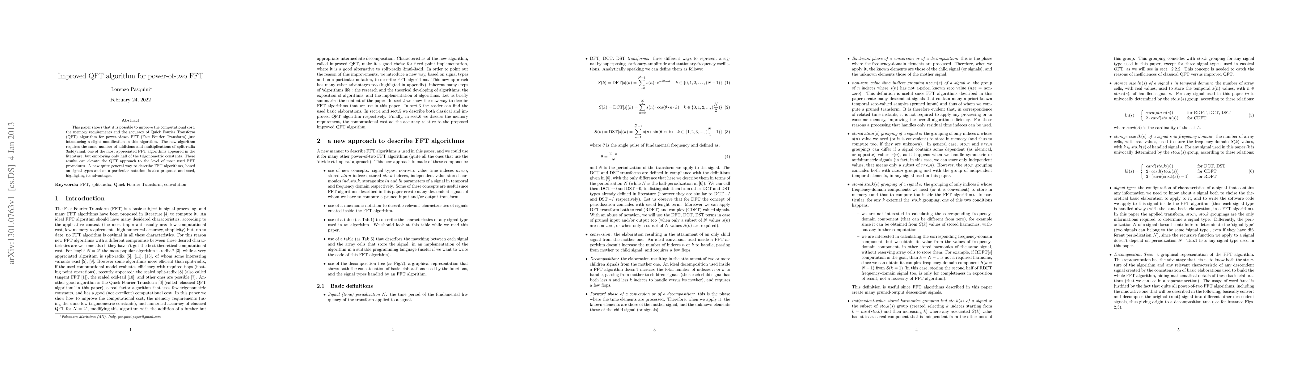 This paper shows that it is possible to improve the computational cost, the memory requirements and the accuracy of Quick Fourier Transform (QFT) algorithm for power-of-two FFT (Fast Fourier Transform) just introducing a slight modification in this algorithm. The new algorithm requires the same number of additions and multiplications of split-radix 3add/3mul, one of the most appreciated FFT algorithms appeared in the literature, but employing only half of the trigonometric constants. These results can elevate the QFT approach to the level of most used FFT procedures. A new quite general way to describe FFT algorithms, based on signal types and on a particular notation, is also proposed and used, highligting its advantages.
