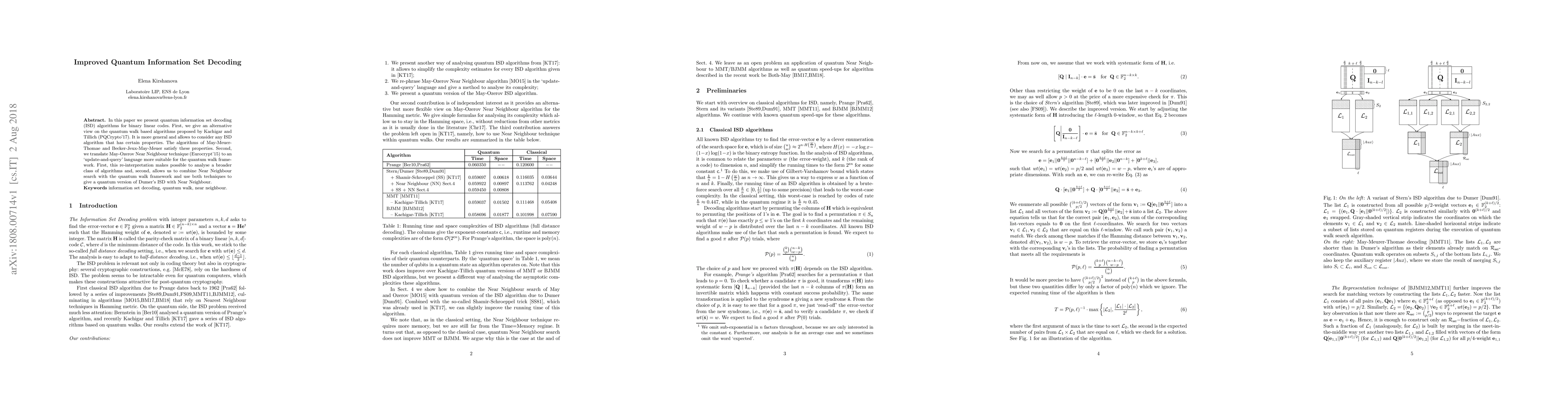 This paper presents improved quantum information set decoding (ISD) algorithms for binary linear codes, reinterpreting quantum walk-based algorithms and translating May-Ozerov's Near Neighbour technique into a quantum framework, enabling a combined approach for a more efficient quantum ISD.