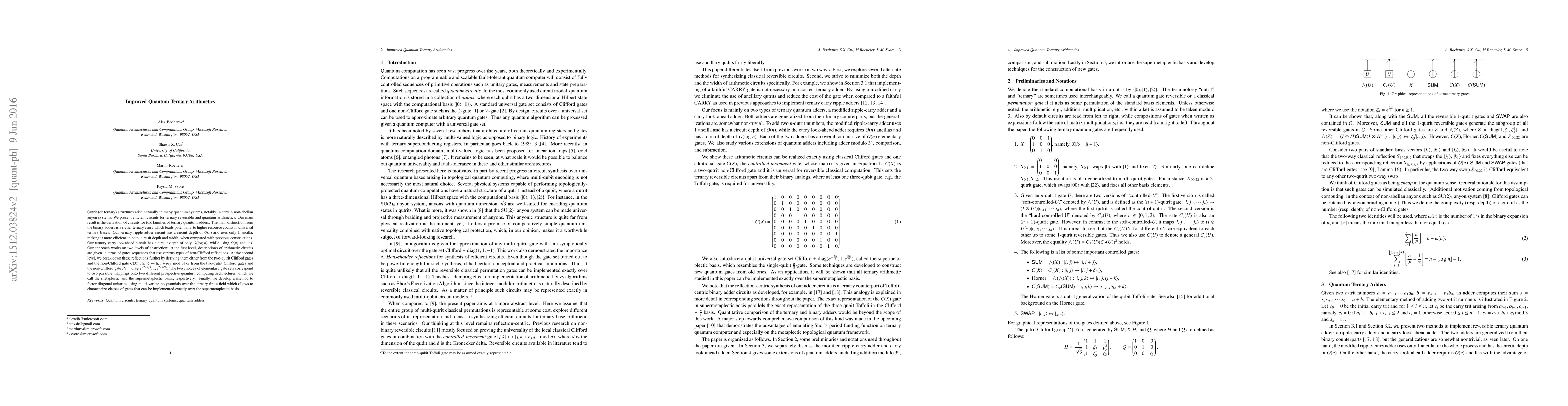 Qutrit (or ternary) structures arise naturally in many quantum systems, particularly in certain non-abelian anyon systems. We present efficient circuits for ternary reversible and quantum arithmetics. Our main result is the derivation of circuits for two families of ternary quantum adders, namely ripple carry adders and carry look-ahead adders. The main difference to the binary case is the more complicated form of the ternary carry, which leads to higher resource counts for implementations over a universal ternary gate set. Our ternary ripple adder circuit has a circuit depth of $O(n)$ and uses only $1$ ancilla, making it more efficient in both, circuit depth and width than previous constructions. Our ternary carry lookahead circuit has a circuit depth of only $O(\log\,n)$, while using with $O(n)$ ancillas. Our approach works on two levels of abstraction: at the first level, descriptions of arithmetic circuits are given in terms of gates sequences that use various types of non-Clifford reflections. At the second level, we break down these reflections further by deriving them either from the two-qutrit Clifford gates and the non-Clifford gate $C(X): |i,j\rangle \mapsto |i, j + \delta_{i,2} \mod 3\rangle$ or from the two-qutrit Clifford gates and the non-Clifford gate $P_9=\mbox{diag}(e^{-2 \pi \, i/9},1,e^{2 \pi \, i/9})$. The two choices of elementary gate sets correspond to two possible mappings onto two different prospective quantum computing architectures which we call the metaplectic and the supermetaplectic basis, respectively. Finally, we develop a method to factor diagonal unitaries using multi-variate polynomial over the ternary finite field which allows to characterize classes of gates that can be implemented exactly over the supermetaplectic basis.