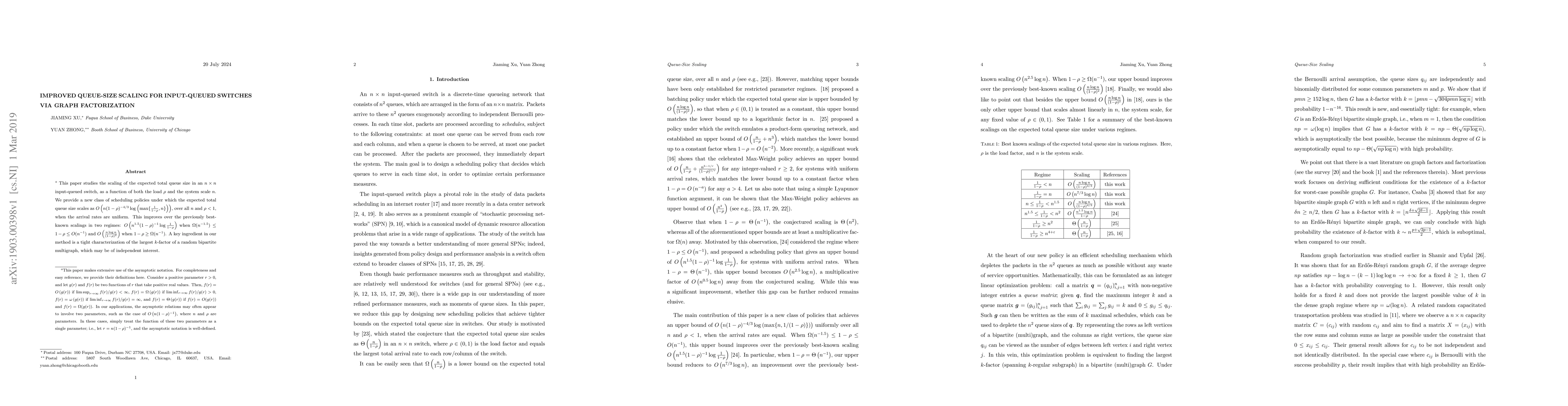 This paper studies the scaling of the expected total queue size in an $n\times n$ input-queued switch, as a function of both the load $\rho$ and the system scale $n$. We provide a new class of scheduling policies under which the expected total queue size scales as $O\left( n(1-\rho)^{-4/3} \log \left(\max\{\frac{1}{1-\rho}, n\}\right)\right)$, over all $n$ and $\rho<1$, when the arrival rates are uniform. This improves over the previously best-known scalings in two regimes: $O\left(n^{1.5}(1-\rho)^{-1} \log \frac{1}{1-\rho}\right)$ when $\Omega(n^{-1.5}) \le 1-\rho \le O(n^{-1})$ and $O\left(\frac{n\log n}{(1-\rho)^2}\right)$ when $1-\rho \geq \Omega(n^{-1})$. A key ingredient in our method is a tight characterization of the largest $k$-factor of a random bipartite multigraph, which may be of independent interest.