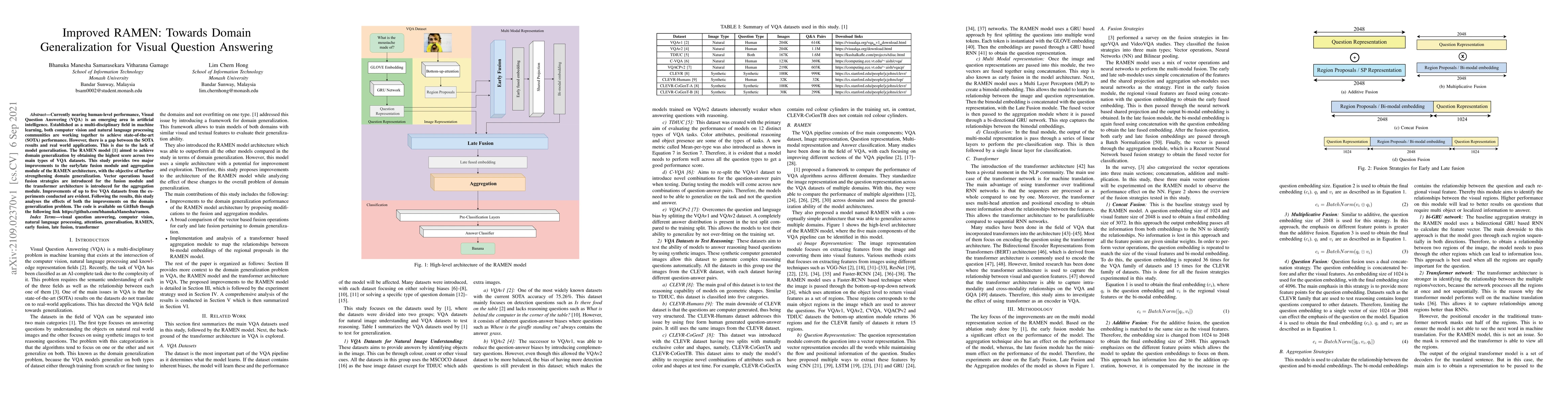 Currently nearing human-level performance, Visual Question Answering (VQA) is an emerging area in artificial intelligence. Established as a multi-disciplinary field in machine learning, both computer vision and natural language processing communities are working together to achieve state-of-the-art (SOTA) performance. However, there is a gap between the SOTA results and real world applications. This is due to the lack of model generalisation. The RAMEN model \cite{Shrestha2019} aimed to achieve domain generalization by obtaining the highest score across two main types of VQA datasets. This study provides two major improvements to the early/late fusion module and aggregation module of the RAMEN architecture, with the objective of further strengthening domain generalization. Vector operations based fusion strategies are introduced for the fusion module and the transformer architecture is introduced for the aggregation module. Improvements of up to five VQA datasets from the experiments conducted are evident. Following the results, this study analyses the effects of both the improvements on the domain generalization problem. The code is available on GitHub though the following link \url{https://github.com/bhanukaManesha/ramen}.