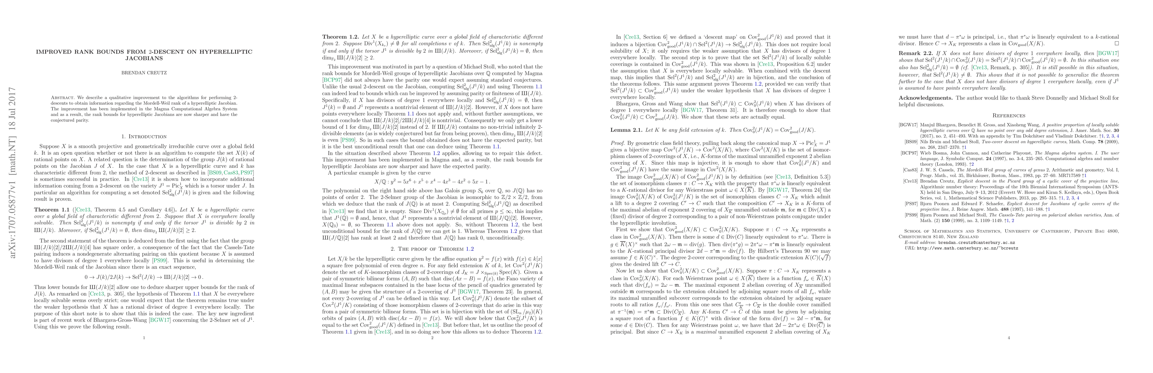Summary: This paper presents an enhanced algorithm for 2-descent on hyperelliptic Jacobians, improving the determination of their Mordell-Weil rank. Implemented in Magma, the new method yields sharper rank bounds with the expected parity.