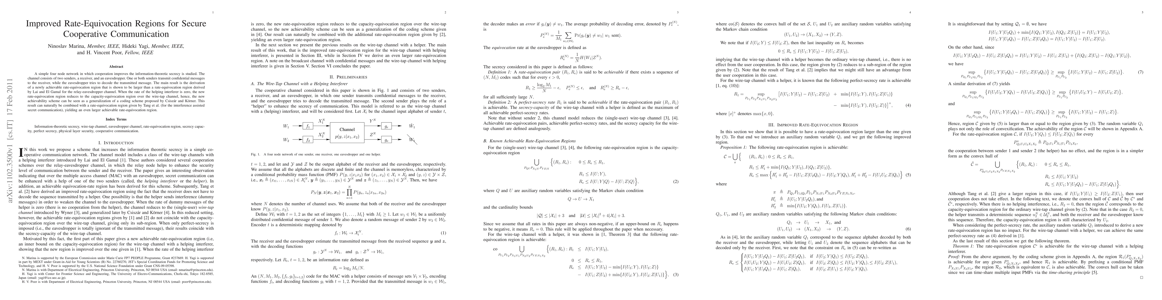 A simple four node network in which cooperation improves the information-theoretic secrecy is studied. The channel consists of two senders, a receiver, and an eavesdropper. One or both senders transmit confidential messages to the receiver, while the eavesdropper tries to decode the transmitted message. The main result is the derivation of a newly achievable rate-equivocation region that is shown to be larger than a rate-equivocation region derived by Lai and El Gamal for the relay-eavesdropper channel. When the rate of the helping interferer is zero, the new rate-equivocation region reduces to the capacity-equivocation region over the wire-tap channel, hence, the new achievability scheme can be seen as a generalization of a coding scheme proposed by Csiszar and Korner. This result can naturally be combined with a rate-equivocation region given by Tang et al. (for the interference assisted secret communication), yielding an even larger achievable rate-equivocation region.