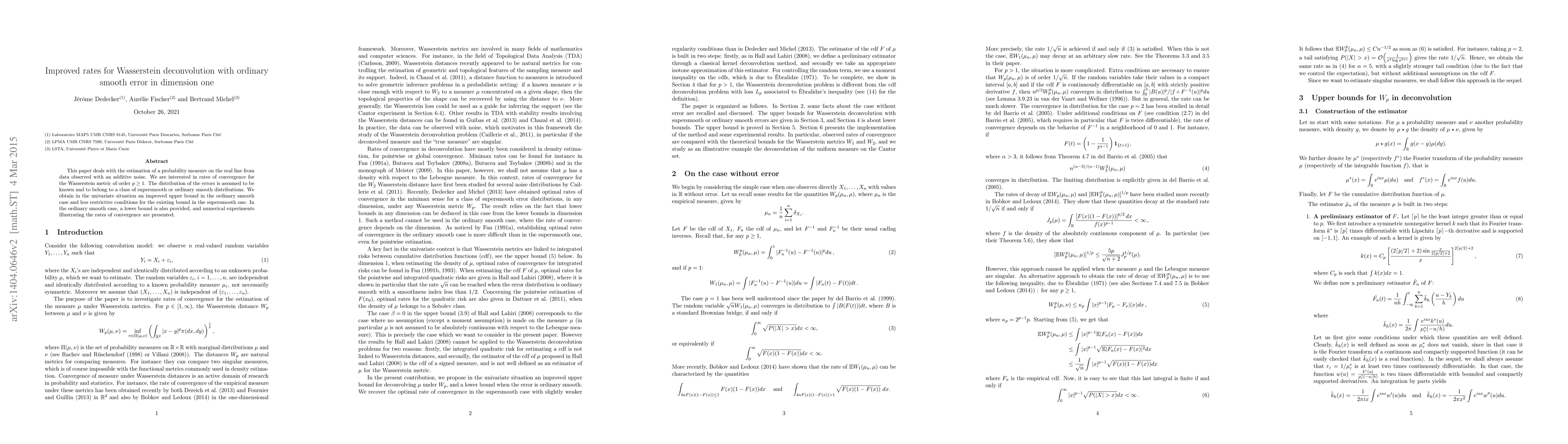 This paper improves convergence rates for estimating a probability measure on the real line under additive noise using the Wasserstein metric, particularly focusing on ordinary smooth error distributions. It provides tighter upper bounds and less restrictive conditions, along with numerical experiments validating the results.