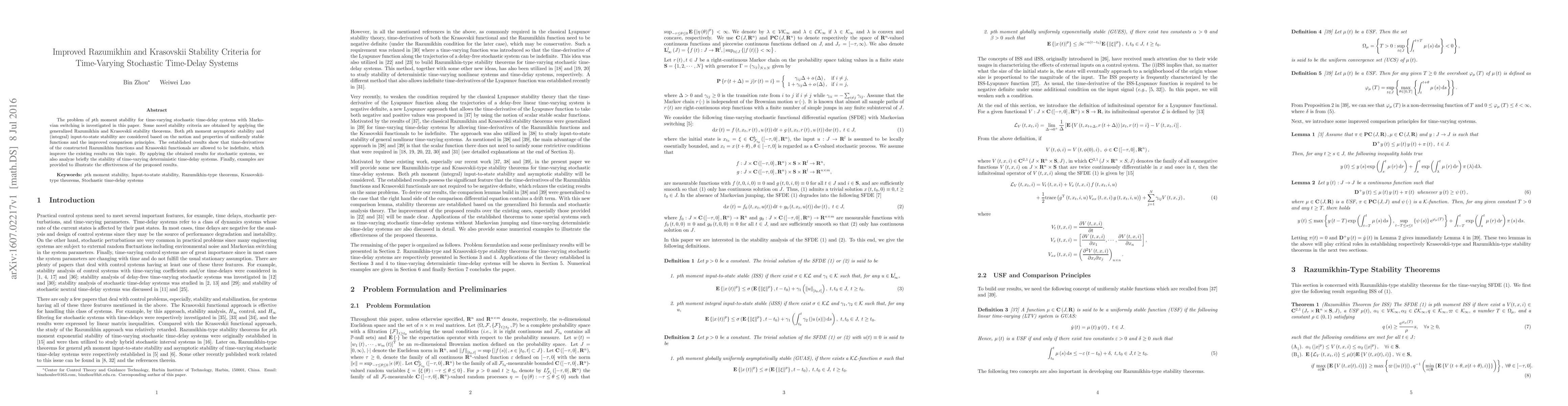 This paper develops improved Razumikhin and Krasovskii stability criteria for time-varying stochastic time-delay systems with Markovian switching. The novel criteria enhance existing results by allowing indefinite time-derivatives of constructed functions, and they also extend the analysis to deterministic systems.