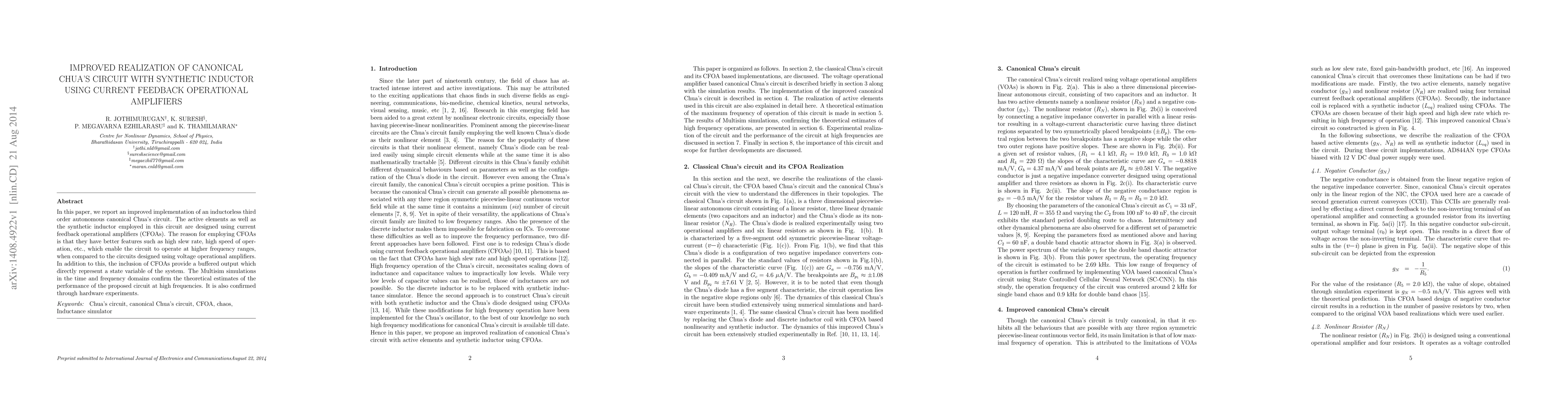 This paper presents an improved inductorless Chua's circuit using current feedback operational amplifiers (CFOAs) for active elements and a synthetic inductor, achieving higher frequency operation and buffered outputs compared to traditional voltage operational amplifiers. Simulation and hardware experiments validate the circuit's performance.