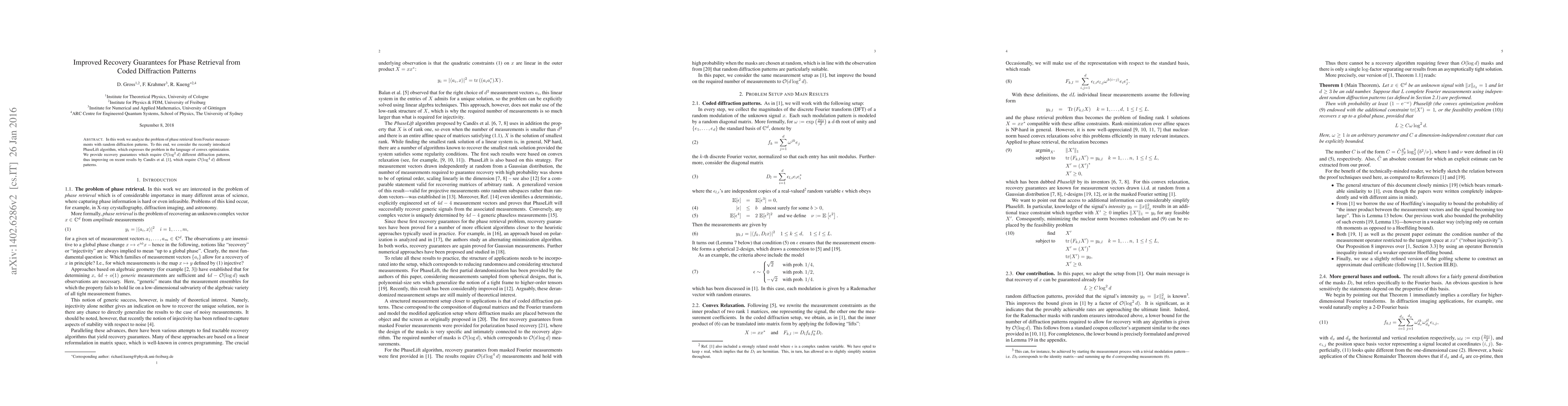 This paper analyzes phase retrieval from coded diffraction patterns using the PhaseLift algorithm, providing improved recovery guarantees that require O(log^2 d) diffraction patterns, surpassing previous results that needed O(log^4 d) patterns.