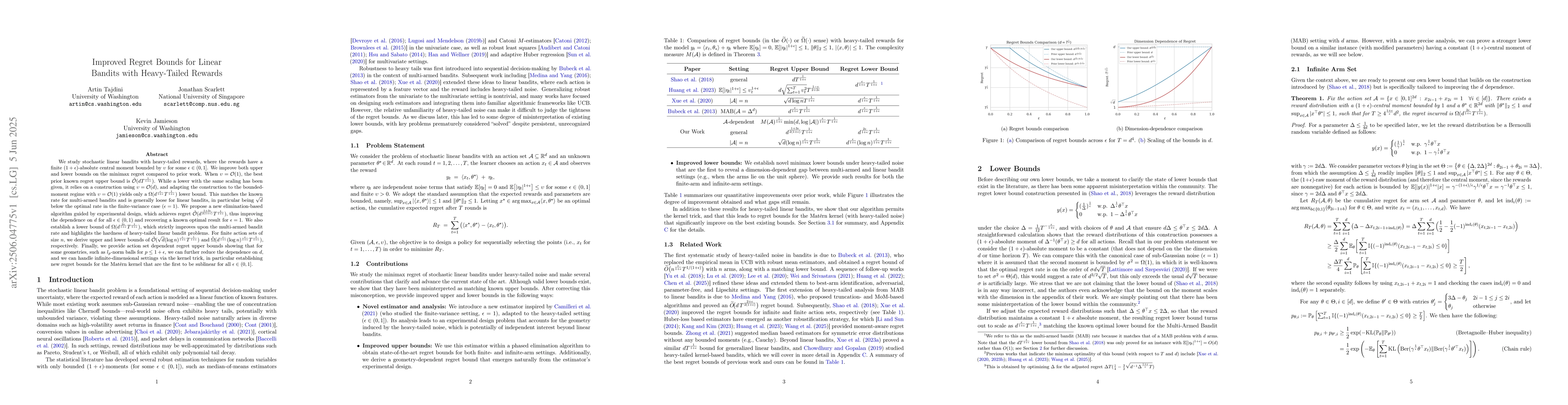 Researchers improved regret bounds for linear bandits with heavy-tailed rewards, achieving a better dependence on action dimension $d$ and establishing new optimal results for finite-variance case.