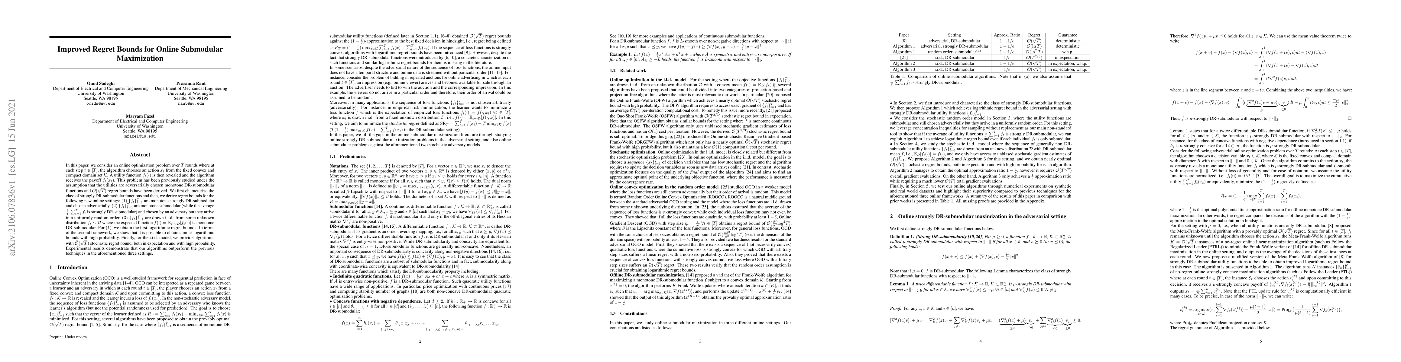 This paper studies online submodular maximization under various settings, deriving improved regret bounds. It achieves logarithmic regret bounds for adversarial monotone strongly DR-submodular functions and $\tilde{\mathcal{O}}(\sqrt{T})$ stochastic regret bounds for i.i.d. drawn monotone DR-submodular functions, outperforming previous techniques.