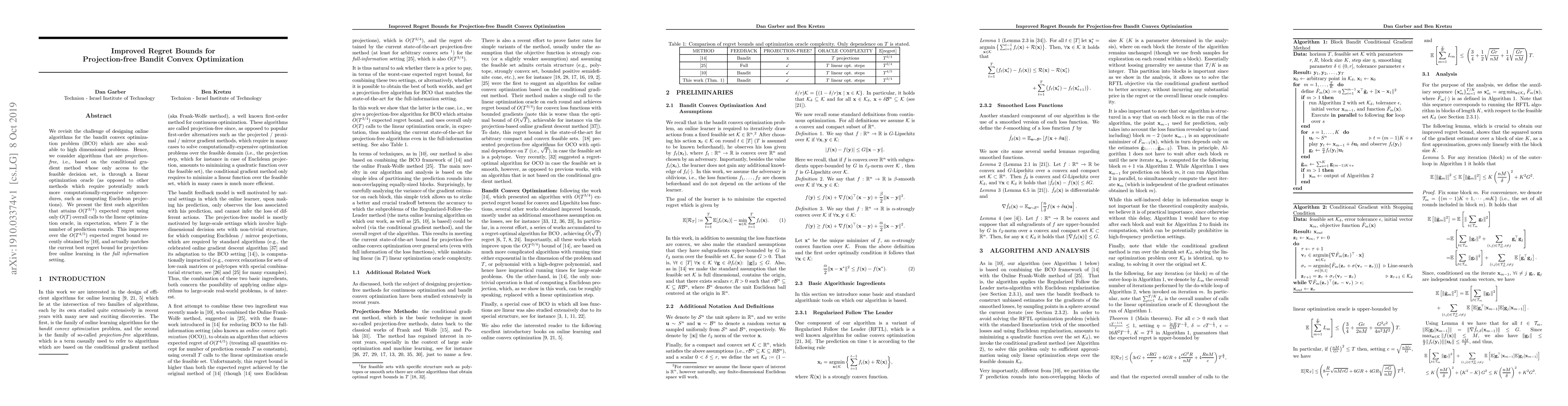This paper proposes a projection-free algorithm for bandit convex optimization, achieving an improved $O(T^{3/4})$ expected regret bound using $O(T)$ calls to a linear optimization oracle, enhancing previous $O(T^{4/5})$ regret bounds and matching the best known results in full information settings.