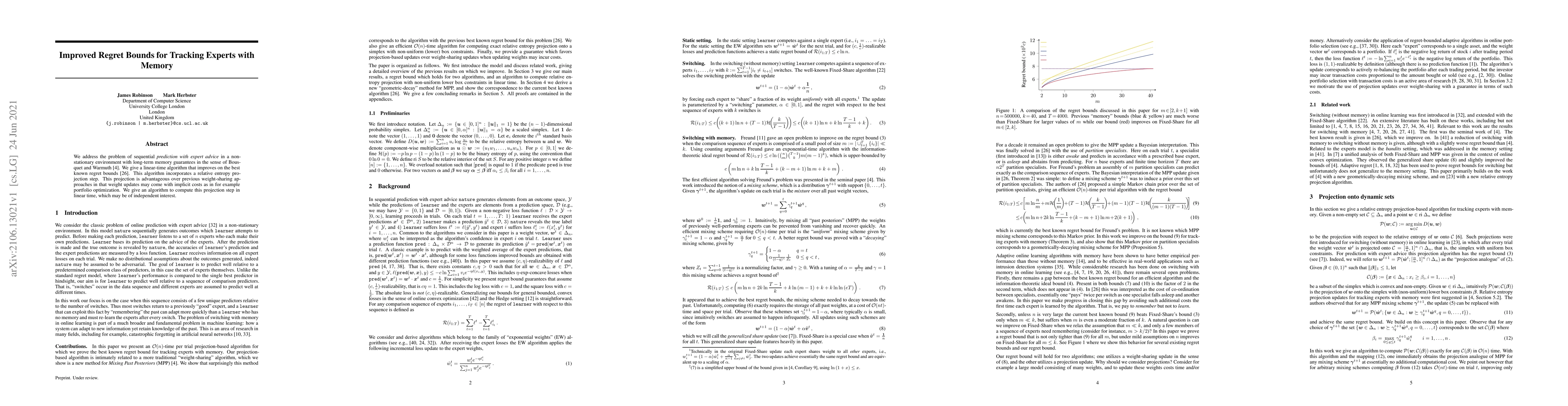 A new algorithm improves regret bounds for sequential prediction with expert advice in non-stationary environments, incorporating a relative entropy projection step that reduces implicit costs.