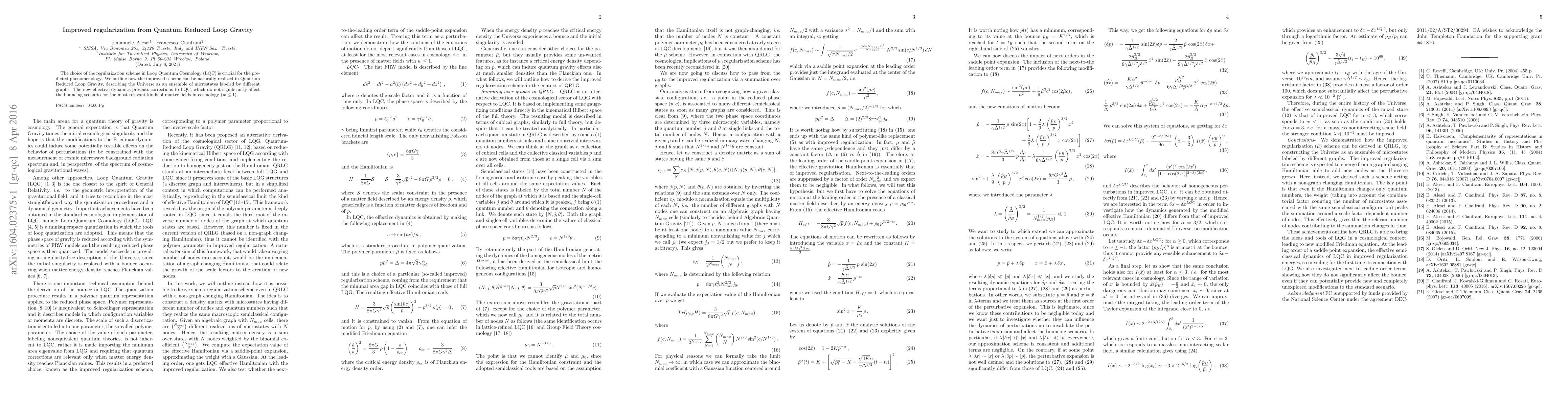 The choice of the regularization scheme in Loop Quantum Cosmology (LQC) is crucial for the predicted phenomenology. We outline how the improved scheme can be naturally realized in Quantum Reduced Loop Gravity, describing the Universe as an ensemble of microstates labeled by different graphs. The new effective dynamics presents corrections to LQC, which do not significantly affect the bouncing scenario for the most relevant kinds of matter fields in cosmology $(w \leq 1)$.
