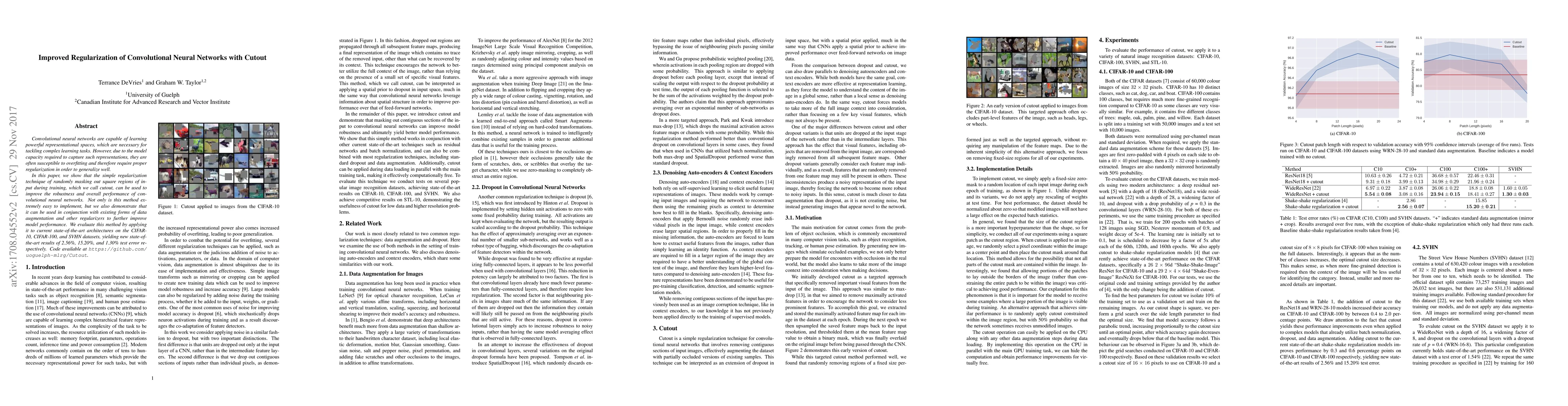 This paper proposes cutout, a simple regularization technique that randomly masks out square regions of input images during training to improve the robustness and performance of convolutional neural networks. The method, easy to implement and effective when combined with other regularizers, achieves new state-of-the-art results on CIFAR-10, CIFAR-100, and SVHN datasets.