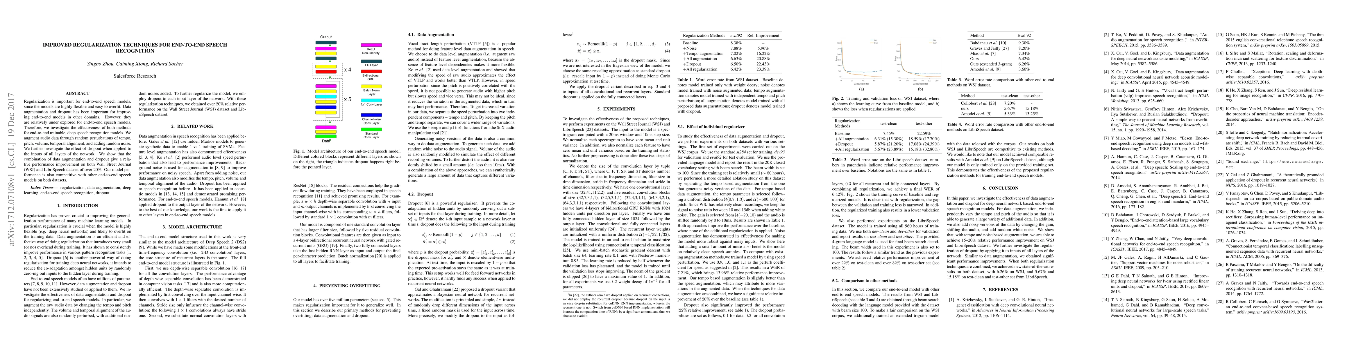 This paper explores the effectiveness of data augmentation and dropout for improving end-to-end speech recognition models, showing a relative performance improvement of over 20% on WSJ and LibriSpeech datasets. The study combines audio data perturbations and dropout across network layers to achieve competitive results.