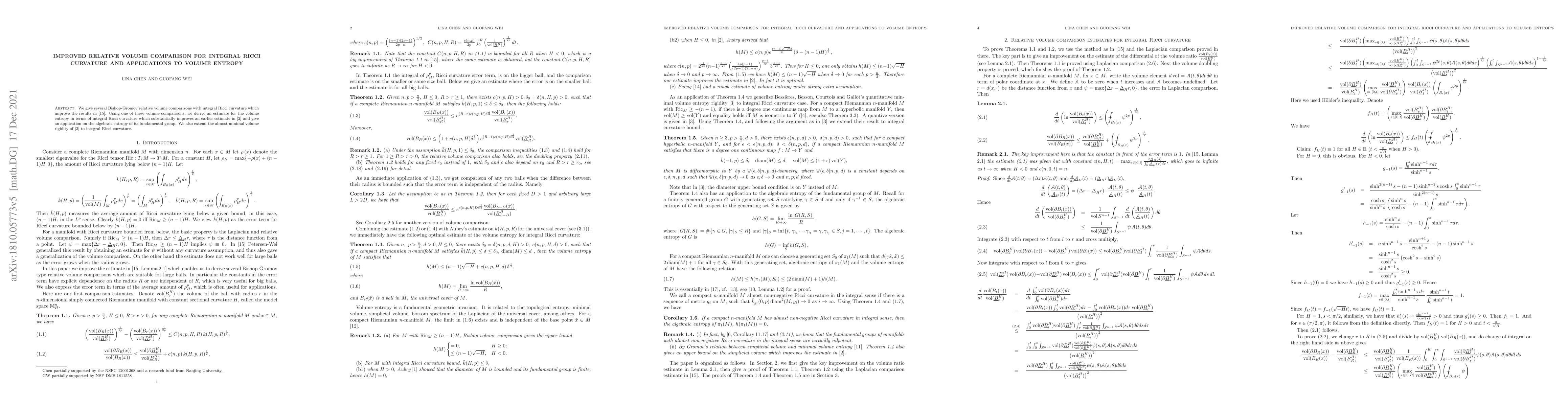 This paper improves Bishop-Gromov relative volume comparisons using integral Ricci curvature, leading to a better estimate for volume entropy and extending volume rigidity results. It also applies these improvements to derive a refined algebraic entropy for fundamental groups.