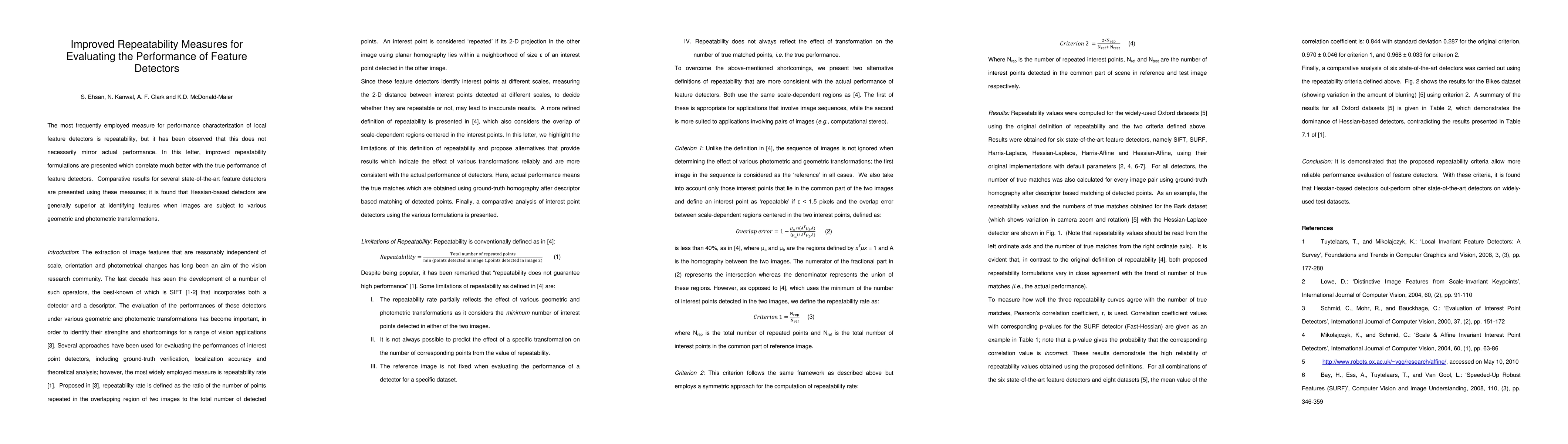 The most frequently employed measure for performance characterisation of local feature detectors is repeatability, but it has been observed that this does not necessarily mirror actual performance. Presented are improved repeatability formulations which correlate much better with the true performance of feature detectors. Comparative results for several state-of-the-art feature detectors are presented using these measures; it is found that Hessian-based detectors are generally superior at identifying features when images are subject to various geometric and photometric transformations.