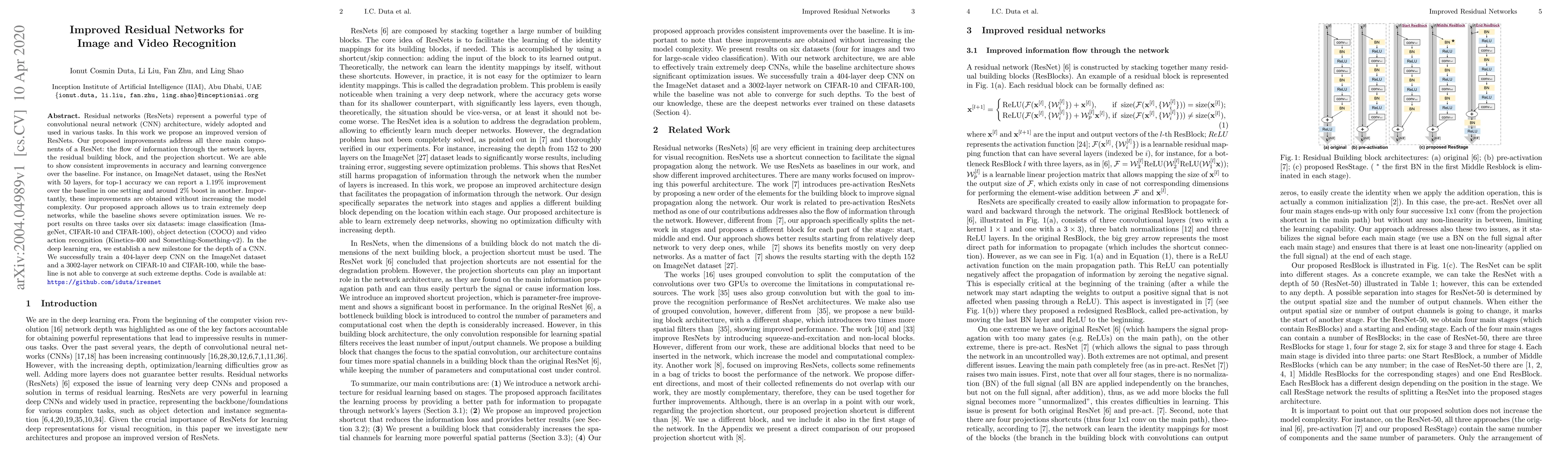 Residual networks (ResNets) represent a powerful type of convolutional neural network (CNN) architecture, widely adopted and used in various tasks. In this work we propose an improved version of ResNets. Our proposed improvements address all three main components of a ResNet: the flow of information through the network layers, the residual building block, and the projection shortcut. We are able to show consistent improvements in accuracy and learning convergence over the baseline. For instance, on ImageNet dataset, using the ResNet with 50 layers, for top-1 accuracy we can report a 1.19% improvement over the baseline in one setting and around 2% boost in another. Importantly, these improvements are obtained without increasing the model complexity. Our proposed approach allows us to train extremely deep networks, while the baseline shows severe optimization issues. We report results on three tasks over six datasets: image classification (ImageNet, CIFAR-10 and CIFAR-100), object detection (COCO) and video action recognition (Kinetics-400 and Something-Something-v2). In the deep learning era, we establish a new milestone for the depth of a CNN. We successfully train a 404-layer deep CNN on the ImageNet dataset and a 3002-layer network on CIFAR-10 and CIFAR-100, while the baseline is not able to converge at such extreme depths. Code is available at: https://github.com/iduta/iresnet