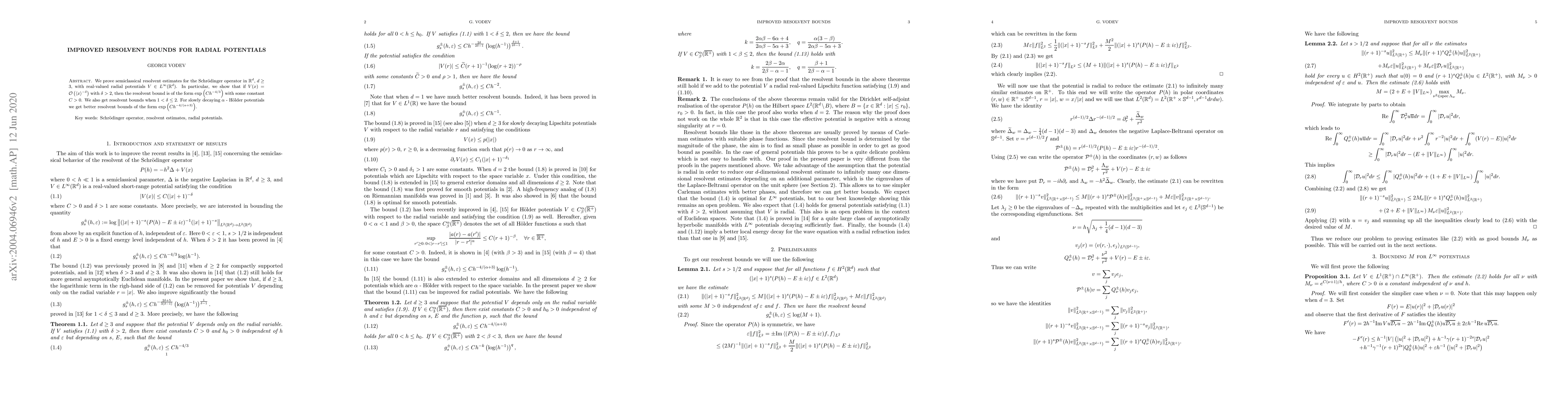 We prove semiclassical resolvent estimates for the Schr{\"o}dinger operator in R d , d $\ge$ 3, with real-valued radial potentials V $\in$ L $\infty$ (R d). In particular, we show that if V (x) = O x --$\delta$ with $\delta$ > 2, then the resolvent bound is of the form e Ch --4/3 with some constant C > 0. We also get resolvent bounds when 1 < $\delta$ $\le$ 2. For slowly decaying $\alpha$-H{\"o}lder potentials we get better resolvent bounds of the form e Ch --4/($\alpha$+3) .