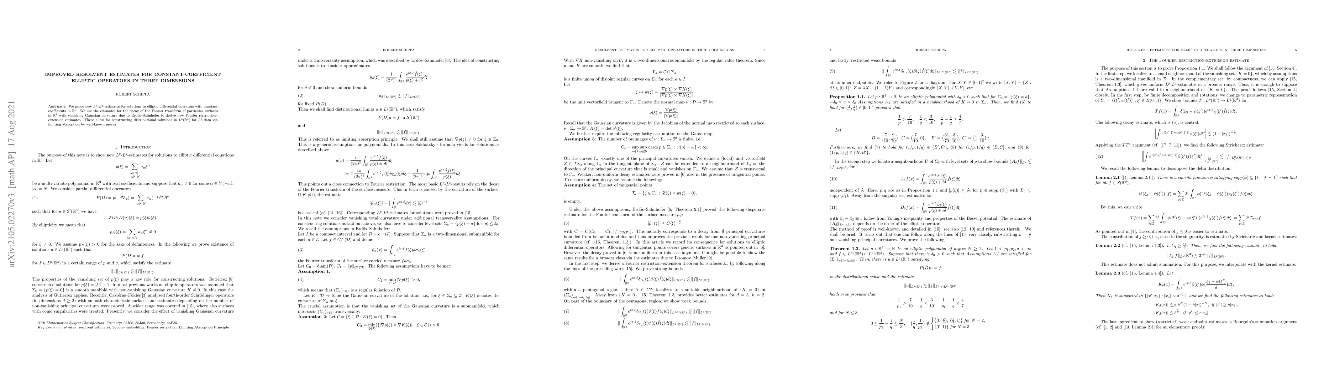 We prove new $L^p$-$L^q$-estimates for solutions to elliptic differential operators with constant coefficients in $\mathbb{R}^3$. We use the estimates for the decay of the Fourier transform of particular surfaces in $\mathbb{R}^3$ with vanishing Gaussian curvature due to Erd\H{o}s--Salmhofer to derive new Fourier restriction--extension estimates. These allow for constructing distributional solutions in $L^q(\mathbb{R}^3)$ for $L^p$-data via limiting absorption by well-known means.