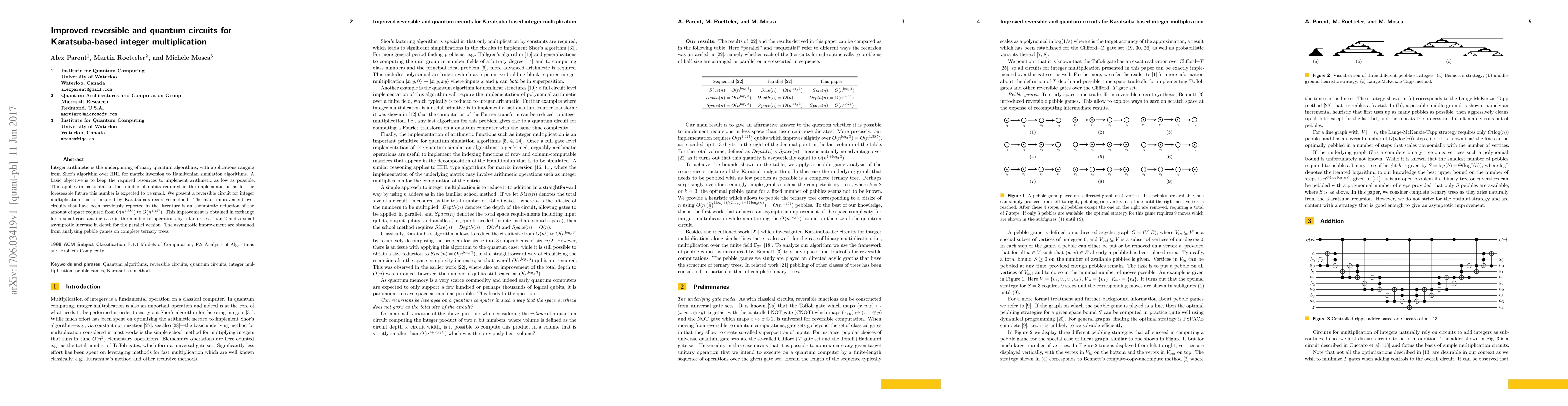 Integer arithmetic is the underpinning of many quantum algorithms, with applications ranging from Shor's algorithm over HHL for matrix inversion to Hamiltonian simulation algorithms. A basic objective is to keep the required resources to implement arithmetic as low as possible. This applies in particular to the number of qubits required in the implementation as for the foreseeable future this number is expected to be small. We present a reversible circuit for integer multiplication that is inspired by Karatsuba's recursive method. The main improvement over circuits that have been previously reported in the literature is an asymptotic reduction of the amount of space required from $O(n^{1.585})$ to $O(n^{1.427})$. This improvement is obtained in exchange for a small constant increase in the number of operations by a factor less than $2$ and a small asymptotic increase in depth for the parallel version. The asymptotic improvement are obtained from analyzing pebble games on complete ternary trees.