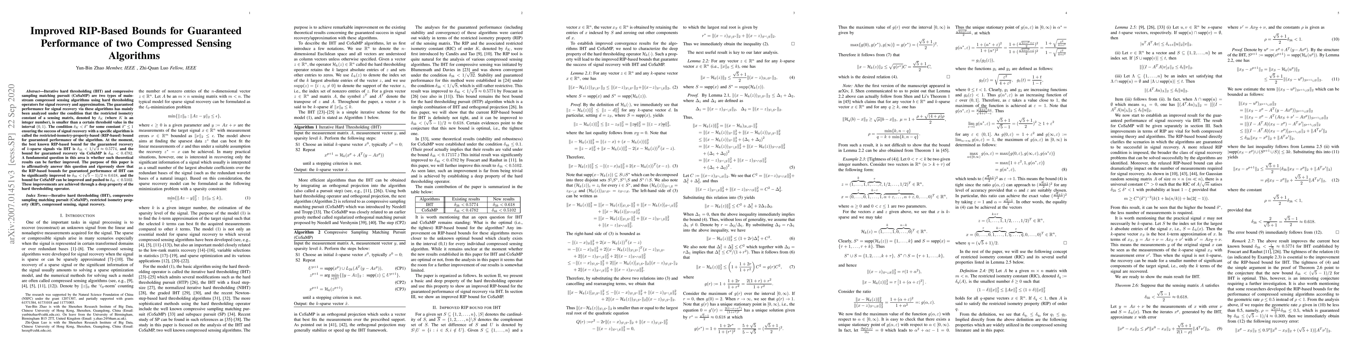 This paper improves the RIP-based bounds for two compressed sensing algorithms, IHT and CoSaMP, by enhancing their theoretical performance guarantees. Specifically, the bound for IHT is improved to $\delta_{3k} < (\sqrt{5}-1)/2 \approx 0.618$, and the CoSaMP bound is improved to $\delta_{4k}< 0.5102$.