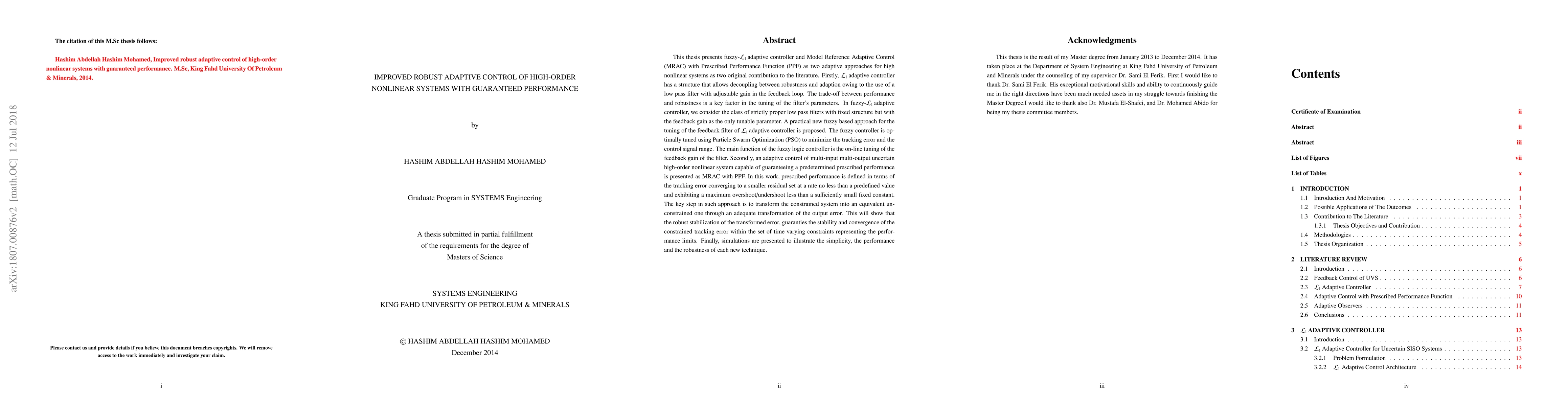 This thesis presents fuzzy-L1 adaptive controller and Model Reference Adaptive Control (MRAC) with Prescribed Performance Function (PPF) as two adaptive approaches for high nonlinear systems as two original contribution to the literature. L1 adaptive controller has a structure that allows decoupling between robustness and adaption owing to the use of a low pass filter with adjustable gain in the feedback loop. A practical new fuzzy based approach for the tuning of the feedback filter of L1 adaptive controller is proposed. The fuzzy controller is optimally tuned using Particle Swarm Optimization (PSO) to minimize the tracking error and the control signal range. An adaptive control of multi-input multi-output uncertain high-order nonlinear system capable of guaranteeing a predetermined prescribed performance is presented as MRAC with PPF. Keywords: Review, L1 adaptive controller, MRAC, twin rotor, UAV, unmanned aerial vehicle, quadrotor, desired, actual, overshoot, neighbourhood, origin, time variant, invariant, simulation, submarine, unmanned underwater vehicle, mobile robot, MARES, stochastic, noise, random, trade off, two degree of freedom planner robot, multi input multi output, single input single output, fuzzy logic controller, fuzzy filter, tuning, optimization, membership function, PSO, MOPSO, multi objective, particle swarm optimization, steady state error, transient performance, asymptotic, assigned, stability, robustness, robust, stable, adaptive control, nonlinear control, uncertain, unknown, prescribed performance function, nonlinear L1 adaptive observer, model.