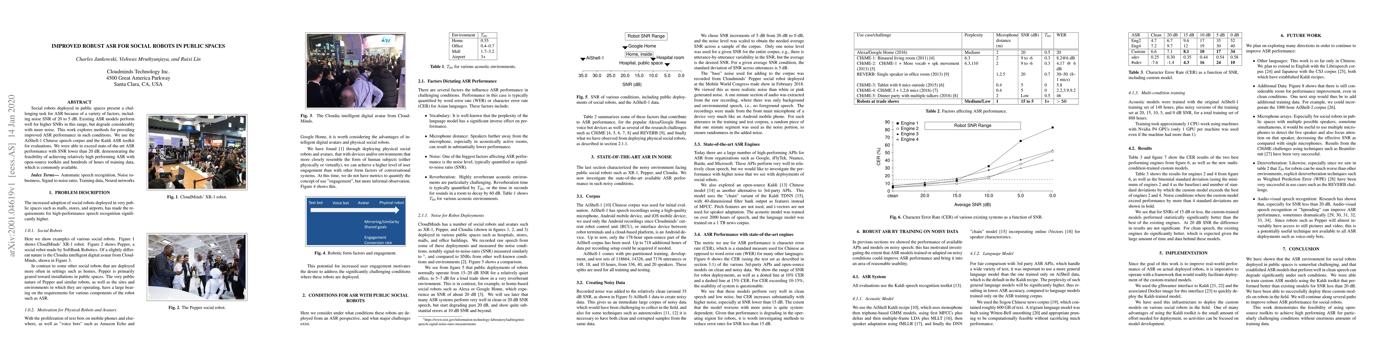 This paper presents methods to enhance robust automatic speech recognition (ASR) for social robots in noisy public environments, achieving state-of-the-art performance with signal-to-noise ratios below 20 dB using the AiShell-1 corpus and Kaldi toolkit. The results show the potential of open-source tools and extensive training data for effective ASR in challenging acoustic conditions.