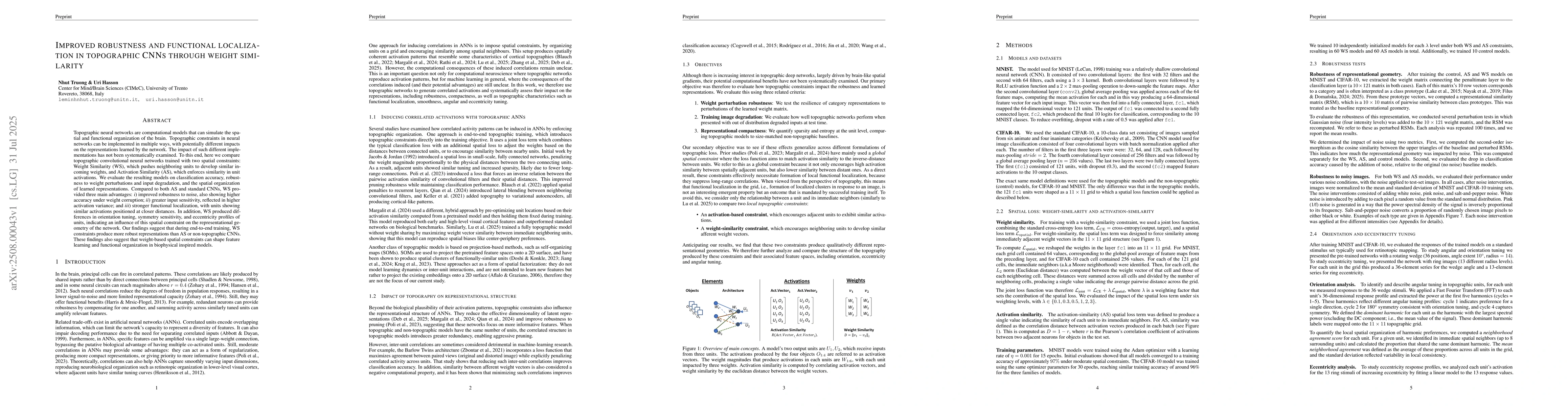 Topographic neural networks are computational models that can simulate the spatial and functional organization of the brain. Topographic constraints in neural networks can be implemented in multiple ways, with potentially different impacts on the representations learned by the network. The impact of such different implementations has not been systematically examined. To this end, here we compare topographic convolutional neural networks trained with two spatial constraints: Weight Similarity (WS), which pushes neighboring units to develop similar incoming weights, and Activation Similarity (AS), which enforces similarity in unit activations. We evaluate the resulting models on classification accuracy, robustness to weight perturbations and input degradation, and the spatial organization of learned representations. Compared to both AS and standard CNNs, WS provided three main advantages: i) improved robustness to noise, also showing higher accuracy under weight corruption; ii) greater input sensitivity, reflected in higher activation variance; and iii) stronger functional localization, with units showing similar activations positioned at closer distances. In addition, WS produced differences in orientation tuning, symmetry sensitivity, and eccentricity profiles of units, indicating an influence of this spatial constraint on the representational geometry of the network. Our findings suggest that during end-to-end training, WS constraints produce more robust representations than AS or non-topographic CNNs. These findings also suggest that weight-based spatial constraints can shape feature learning and functional organization in biophysical inspired models.