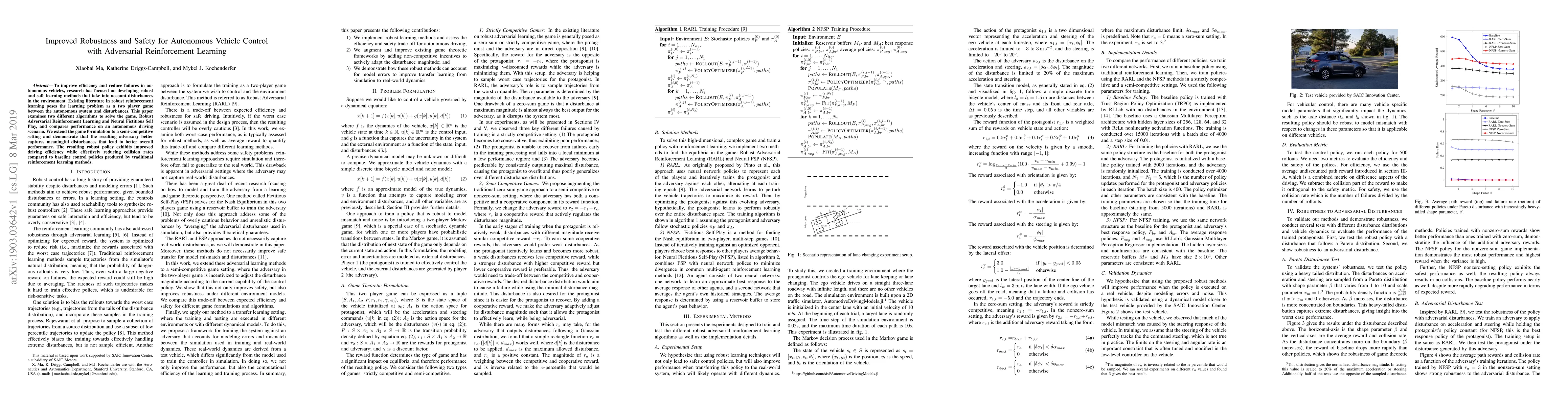 This paper explores two adversarial reinforcement learning algorithms—Robust Adversarial Reinforcement Learning and Neural Fictitious Self Play—to enhance the robustness and safety of autonomous vehicle control. The study finds that the semi-competitive setting improves the capture of meaningful disturbances, leading to better driving efficiency and reduced collision rates compared to baseline methods.