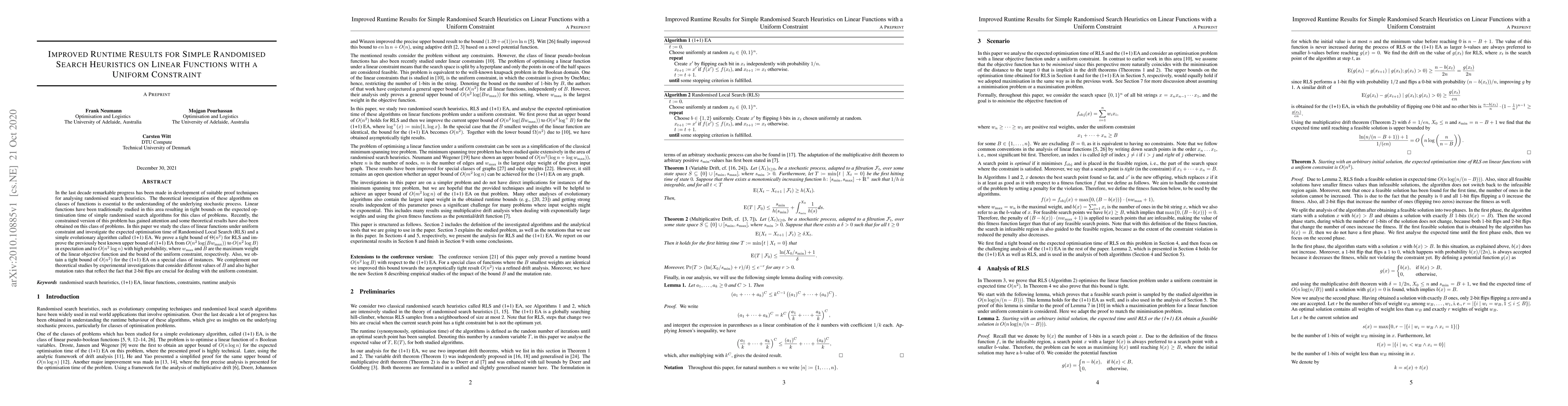 This paper investigates the optimisation performance of Randomised Local Search (RLS) and the (1+1) evolutionary algorithm on linear functions under a uniform constraint. It establishes a tight bound of $\Theta(n^2)$ for RLS and improves the upper bound for the (1+1) EA from $O(n^2 \log (Bw_{\max}))$ to $O(n^2 \log B)$ in expectation, complemented by experimental studies on various constraint values and mutation rates.