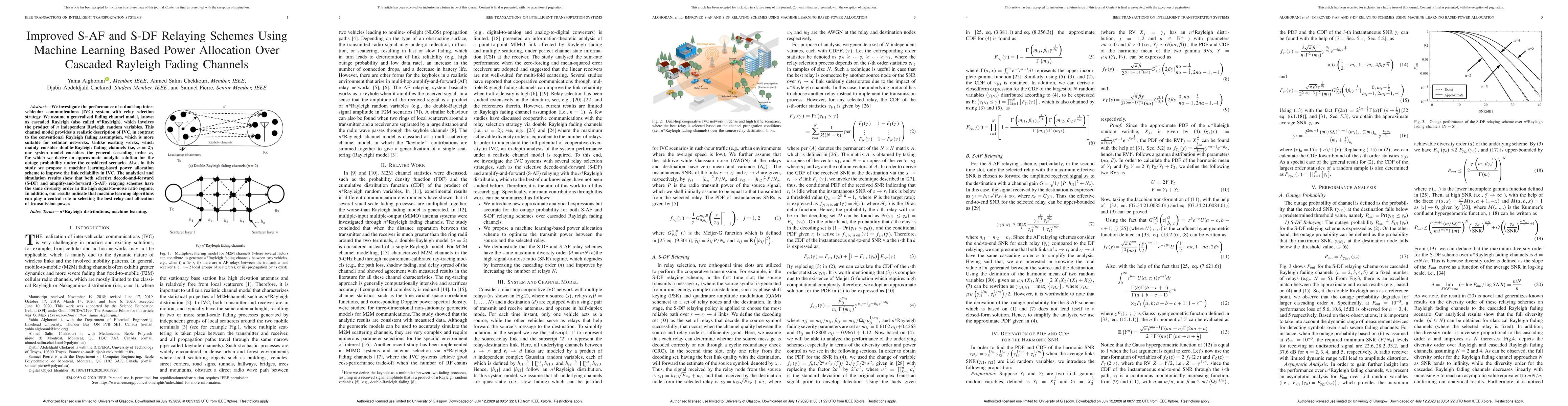 This paper proposes improved relaying schemes using machine learning for intervehicular communications, considering a generalized cascaded Rayleigh fading model. It demonstrates that machine learning-based power allocation enhances link reliability and achieves the same diversity order for S-DF and S-AF relaying schemes.