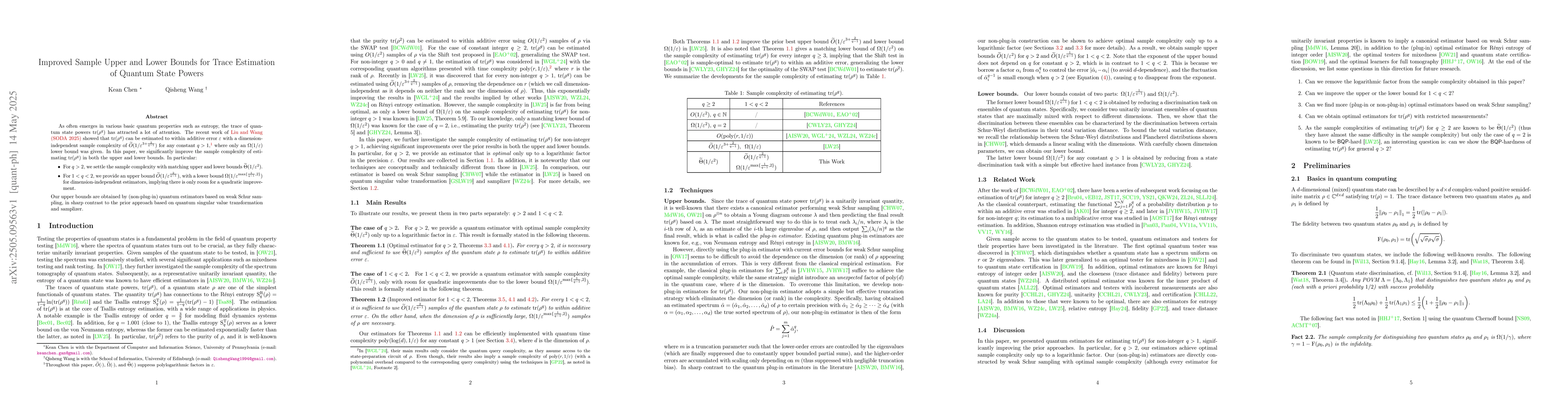 The paper presents improved upper and lower bounds for the sample complexity of estimating tr(ρ^q) using novel quantum estimators based on weak Schur sampling.