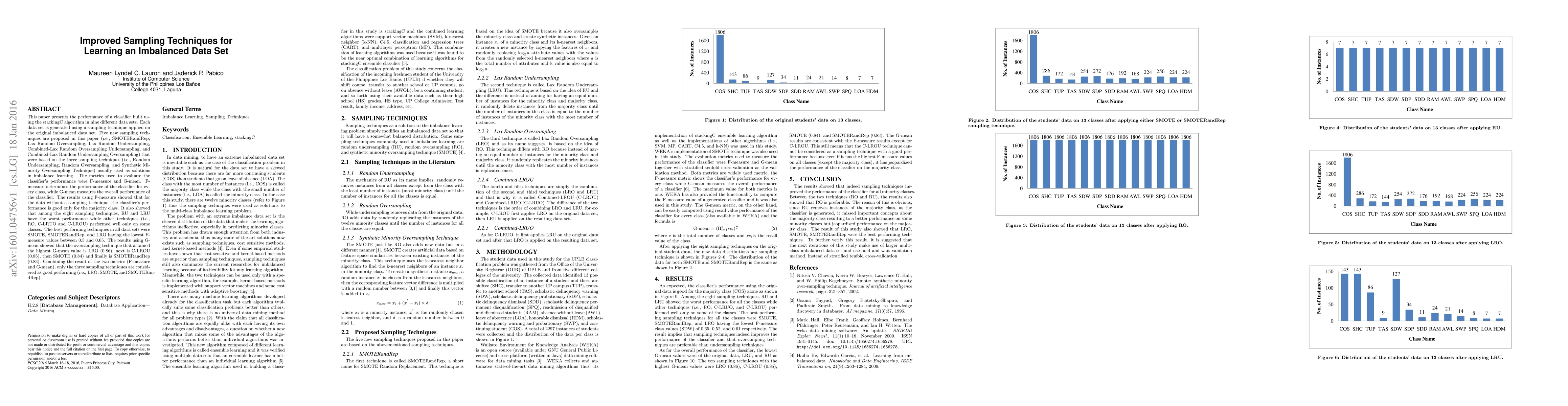 This paper evaluates a classifier's performance on nine imbalanced datasets, generated using various sampling techniques including five new proposals (SMOTERandRep, Lax Random Oversampling, Lax Random Undersampling, Combined-Lax Random Oversampling Undersampling, Combined-Lax Random Undersampling Oversampling). The classifier's performance was measured using F-measure and G-mean metrics. Results indicate that LRO, SMOTE, and SMOTERandRep were the top-performing techniques, improving classification for minority classes.