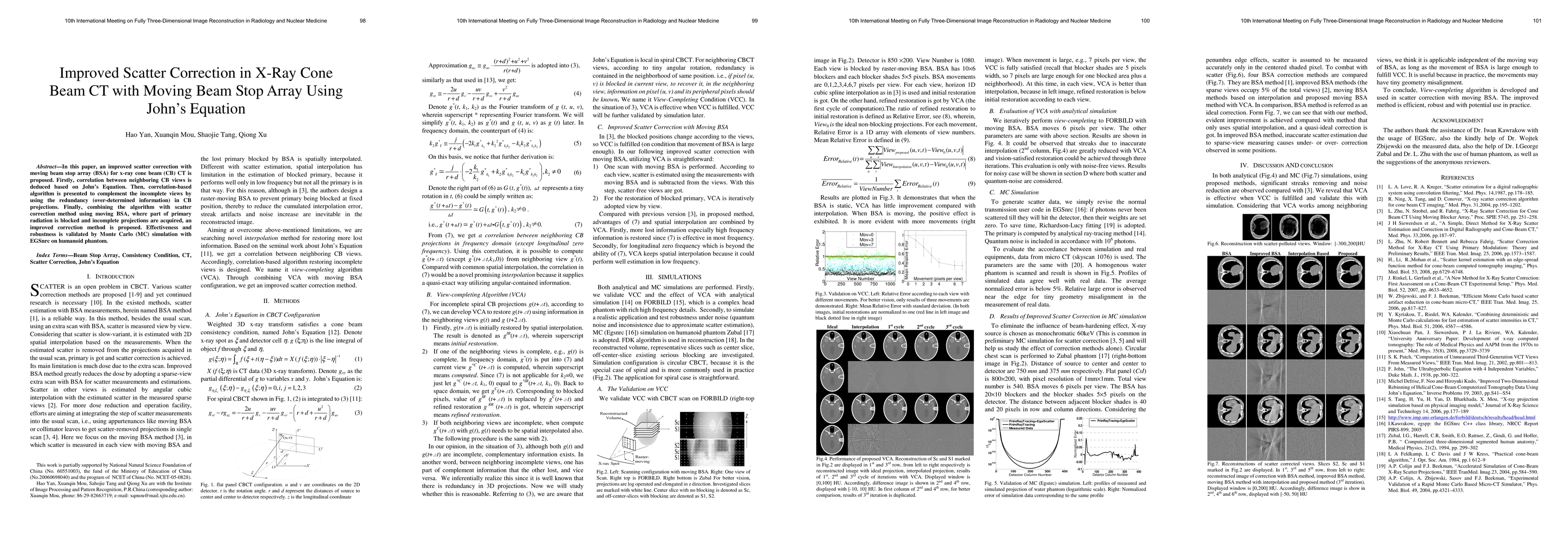 This paper proposes an enhanced scatter correction method for x-ray cone beam CT using a moving beam stop array, leveraging John's Equation to deduce correlations between CB views and employing a correlation-based algorithm to fill incomplete projections. The method's effectiveness is validated through Monte Carlo simulations on a humanoid phantom.