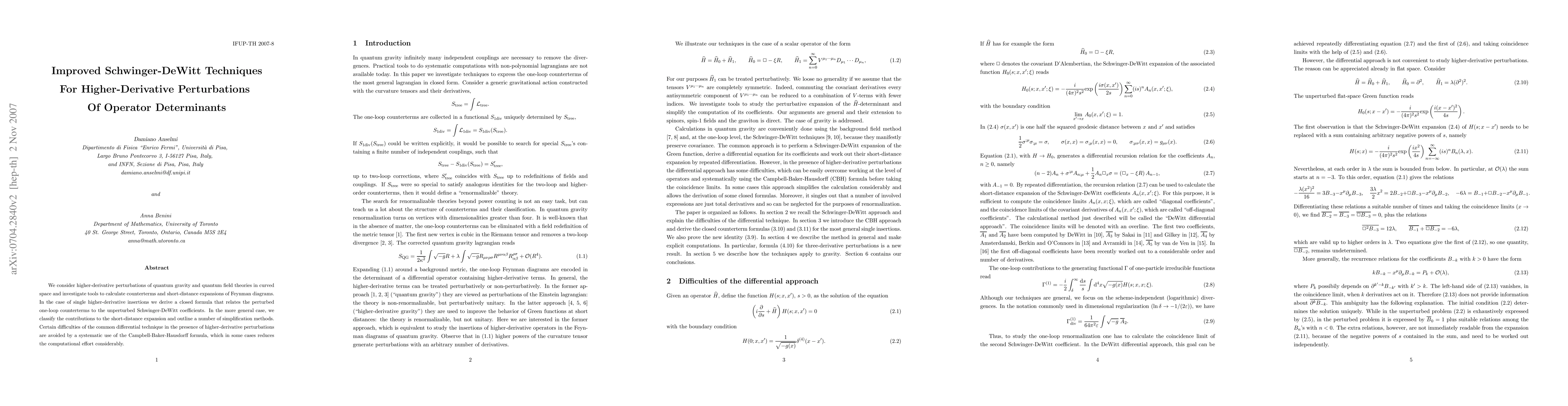 This paper develops improved Schwinger-DeWitt techniques for calculating counterterms in higher-derivative perturbations of quantum gravity and field theories. It provides a closed formula for single higher-derivative insertions and outlines simplification methods for general cases, using the Campbell-Baker-Hausdorff formula to reduce computational complexity.