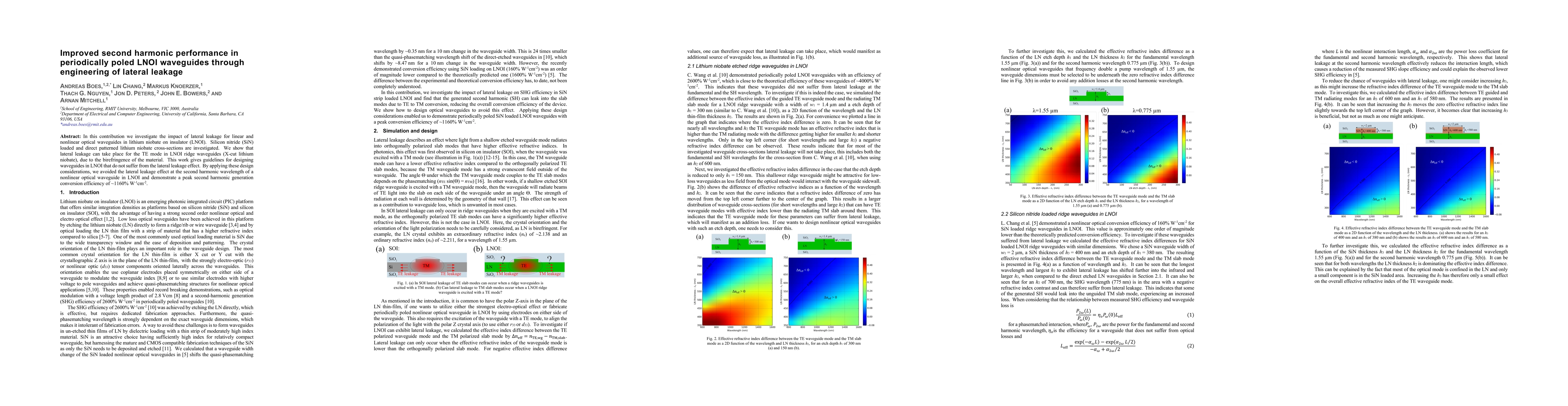 This study explores the influence of lateral leakage on linear and nonlinear optical waveguides in LNOI and finds that it can occur in TE mode LNOI ridge waveguides due to material birefringence. By engineering waveguide design to avoid this effect, the researchers achieved a peak second harmonic generation conversion efficiency of ~1160% W-1cm-2.