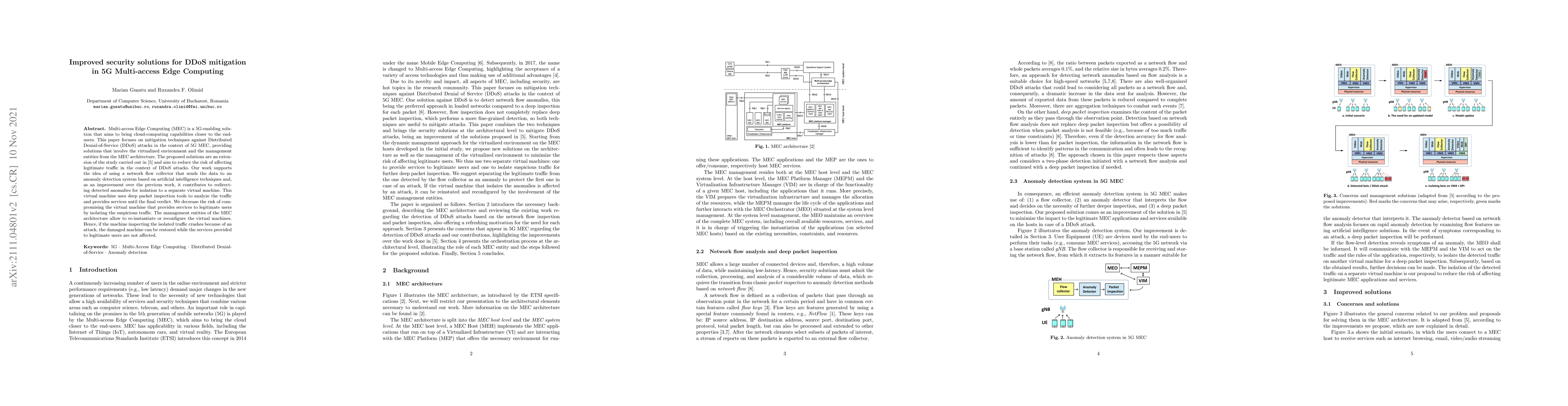 Multi-access Edge Computing (MEC) is a 5G-enabling solution that aims to bring cloud-computing capabilities closer to the end-users. This paper focuses on mitigation techniques against Distributed Denial-of-Service (DDoS) attacks in the context of 5G MEC, providing solutions that involve the virtualized environment and the management entities from the MEC architecture. The proposed solutions aim to reduce the risk of affecting legitimate traffic in the context of DDoS attacks. Our work supports the idea of using a network flow collector that sends the data to an anomaly detection system based on artificial intelligence techniques and, as an improvement over the previous work, it contributes to redirecting detected anomalies for isolation to a separate virtual machine. This virtual machine uses deep packet inspection tools to analyze the traffic and provides services until the final verdict. We decrease the risk of compromising the virtual machine that provides services to legitimate users by isolating the suspicious traffic. The management entities of the MEC architecture allow to re-instantiate or reconfigure the virtual machines. Hence, if the machine inspecting the isolated traffic crashes because of an attack, the damaged machine can be restored while the services provided to legitimate users are not affected.