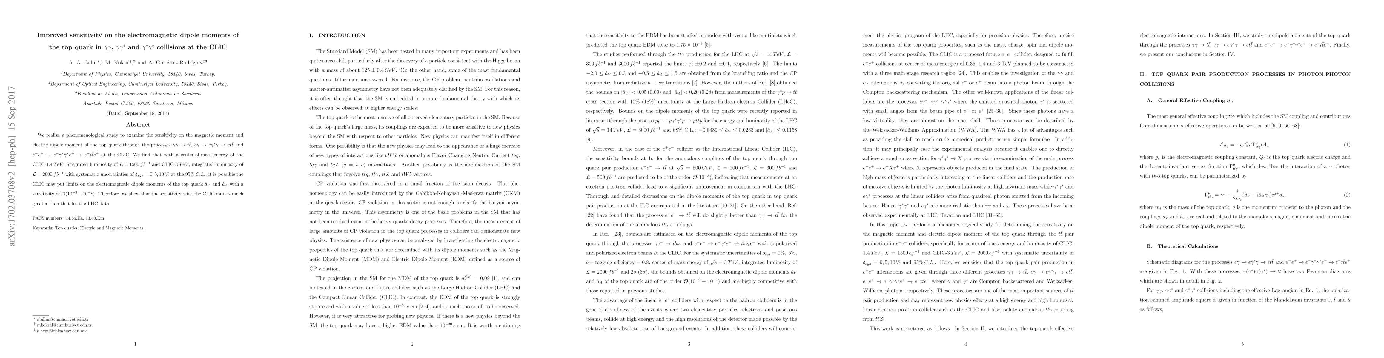 We realize a phenomenological study to examine the sensitivity on the magnetic moment and electric dipole moment of the top quark through the processes $\gamma\gamma\rightarrow t \bar{t}$, $e \gamma \rightarrow e \gamma^{*} \gamma \rightarrow e t \bar{t}$ and $e^{-} e^{+}\rightarrow e^{-} \gamma^{*} \gamma^{*} e^{+} \rightarrow e^{-} t \bar{t}e^{+}$ at the CLIC. We find that with a center-of-mass energy of the CLIC-1.4$\hspace{0.8mm}TeV$, integrated luminosity of ${\cal L}=1500\hspace{0.8mm}fb^{-1}$ and CLIC-3$\hspace{1mm}TeV$, integrated luminosity of ${\cal L}=2000\hspace{0.8mm}fb^{-1}$ with systematic uncertainties of $\delta_{sys}=0, 5, 10\hspace{1mm}\%$ at the $95\%\hspace{1mm}C. L.$, it is possible the CLIC may put limits on the electromagnetic dipole moments of the top quark $\hat a_V$ and $\hat a_A$ with a sensitivity of ${\cal O}(10^{-3}-10^{-2})$. Therefore, we show that the sensitivity with the CLIC data is much greater than that for the LHC data.