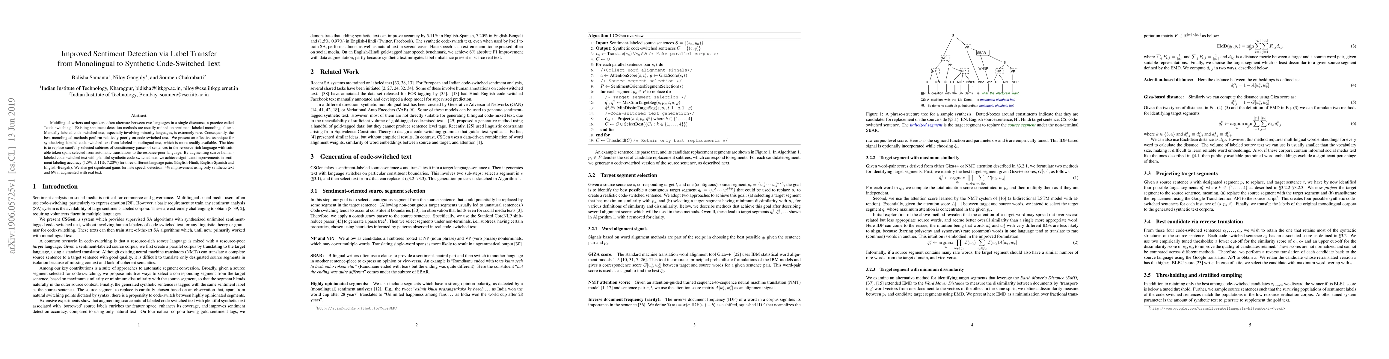This paper proposes a method to enhance sentiment detection in code-switched text by synthesizing labeled examples from monolingual data. The technique involves replacing parts of sentences in resource-rich languages with translated segments, significantly improving sentiment detection accuracy and hate speech detection by augmenting synthetic and real code-switched text.