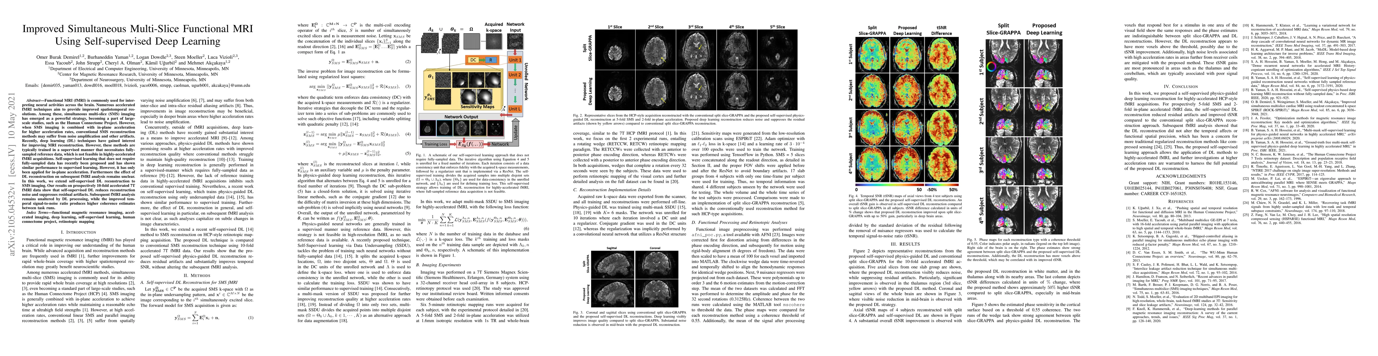 This paper proposes a self-supervised deep learning approach to improve simultaneous multi-slice fMRI reconstruction, addressing noise amplification and artifacts in high acceleration rates. The method enhances temporal signal-to-noise ratio without affecting subsequent fMRI analysis, leading to higher coherence estimates.