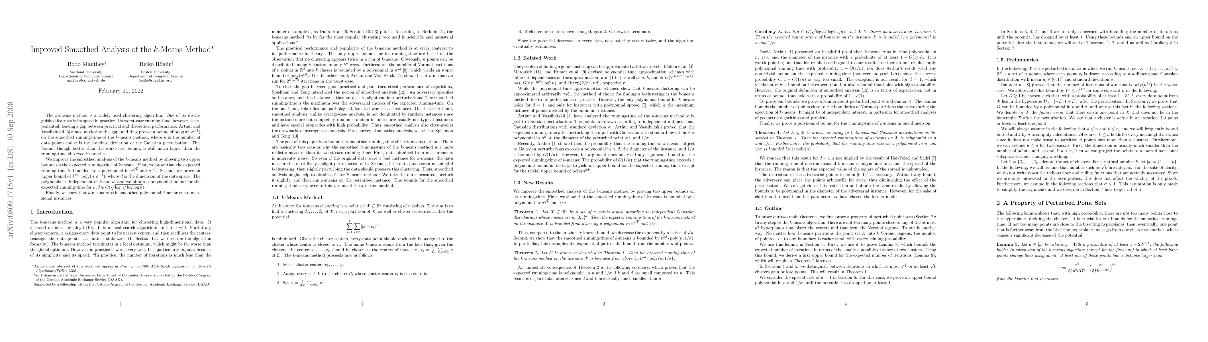 The k-means method's smoothed running time is improved with new bounds on expected running time, achieving polynomial bounds for specific parameters like dimensionality and dataset size.