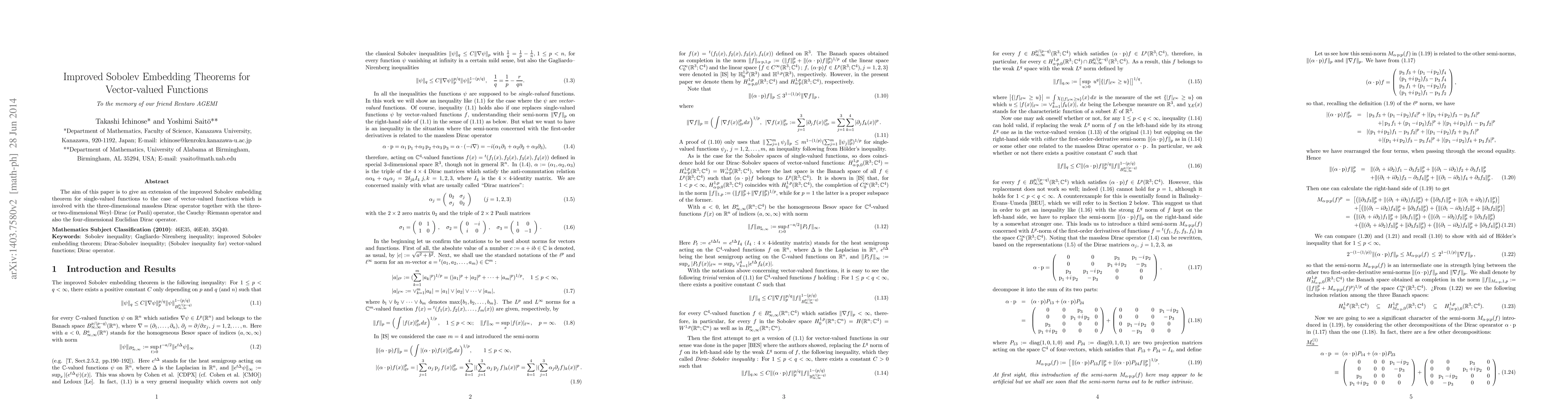 This paper extends improved Sobolev embedding theorems from single-valued to vector-valued functions, incorporating the three-dimensional massless Dirac operator and related operators like the Weyl-Dirac, Cauchy-Riemann, and four-dimensional Euclidean Dirac operators.