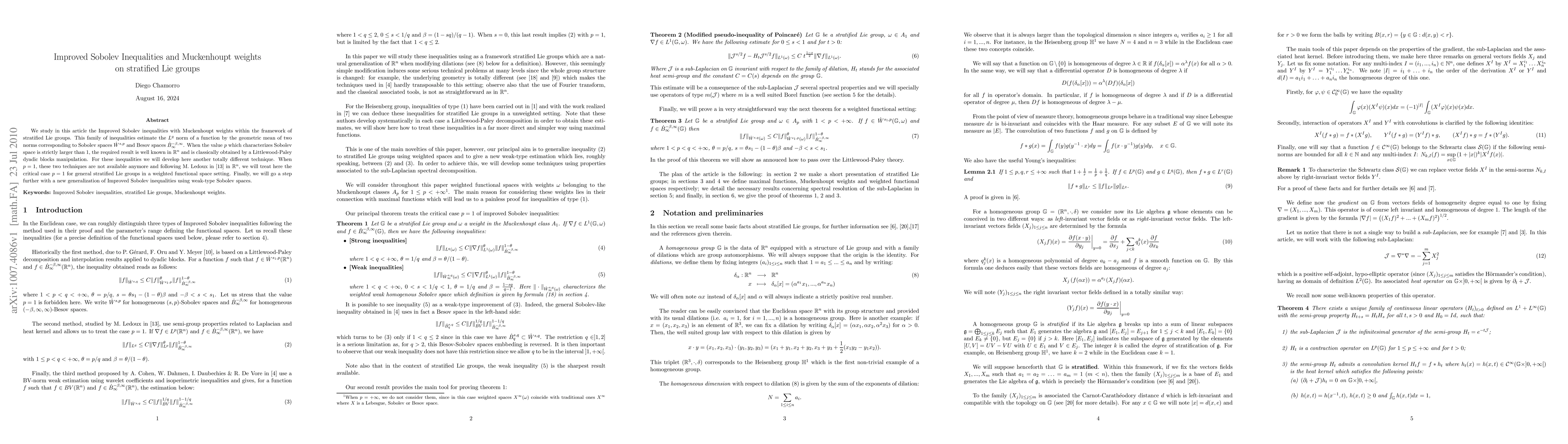 We study in this article the Improved Sobolev inequalities with Muckenhoupt weights within the framework of stratified Lie groups. This family of inequalities estimate the Lq norm of a function by the geometric mean of two norms corresponding to Sobolev spaces W(s;p) and Besov spaces B(-b, infty, infty). When the value p which characterizes Sobolev space is strictly larger than 1, the required result is well known in R^n and is classically obtained by a Littlewood-Paley dyadic blocks manipulation. For these inequalities we will develop here another totally different technique. When p = 1, these two techniques are not available anymore and following M. Ledoux in R^n, we will treat here the critical case p = 1 for general stratified Lie groups in a weighted functional space setting. Finally, we will go a step further with a new generalization of Improved Sobolev inequalities using weak-type Sobolev spaces.