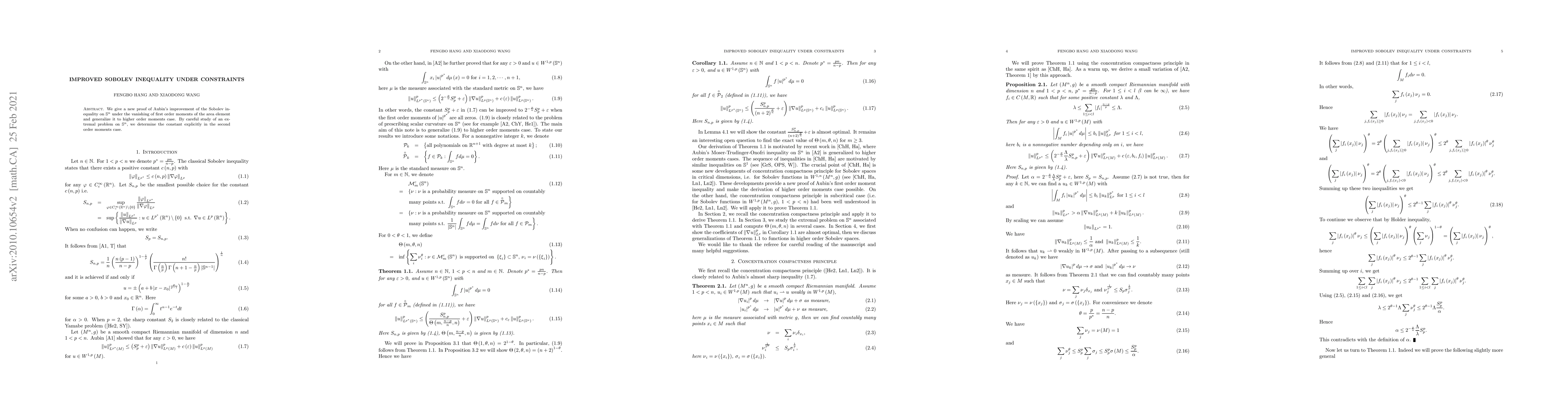 We give a new proof of Aubin's improvement of the Sobolev inequality on $\mathbb{S}^{n}$ under the vanishing of first order moments of the area element and generalize it to higher order moments case. By careful study of an extremal problem on $\mathbb{S}^{n}$, we determine the constant explicitly in the second order moments case.