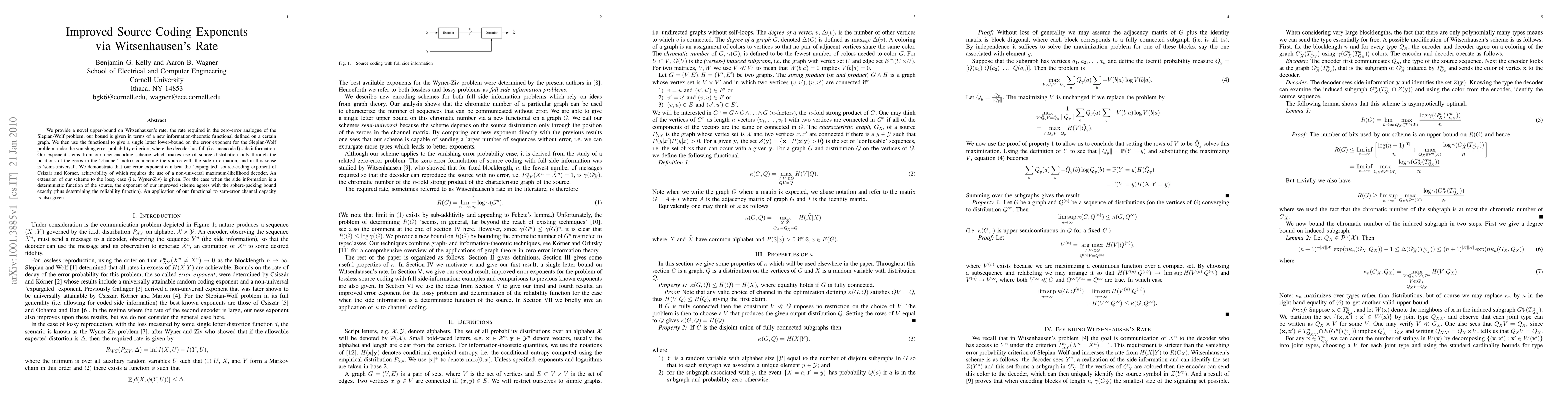 We provide a novel upper-bound on Witsenhausen's rate, the rate required in the zero-error analogue of the Slepian-Wolf problem; our bound is given in terms of a new information-theoretic functional defined on a certain graph. We then use the functional to give a single letter lower-bound on the error exponent for the Slepian-Wolf problem under the vanishing error probability criterion, where the decoder has full (i.e. unencoded) side information. Our exponent stems from our new encoding scheme which makes use of source distribution only through the positions of the zeros in the `channel' matrix connecting the source with the side information, and in this sense is `semi-universal'. We demonstrate that our error exponent can beat the `expurgated' source-coding exponent of Csisz\'{a}r and K\"{o}rner, achievability of which requires the use of a non-universal maximum-likelihood decoder. An extension of our scheme to the lossy case (i.e. Wyner-Ziv) is given. For the case when the side information is a deterministic function of the source, the exponent of our improved scheme agrees with the sphere-packing bound exactly (thus determining the reliability function). An application of our functional to zero-error channel capacity is also given.